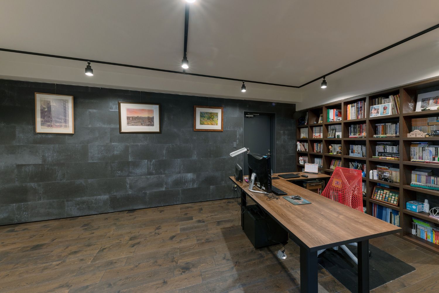 メゾネットタイプの住戸で下の階に設けた、約26㎡の書斎。アクセントタイルと濃い色味のフローリングで、『秘密基地』のような印象に仕上げ、仕事と趣味に没頭できる空間になっています。建物の持つ防音性に優れた特性を活かし、音楽など音が気になる趣味も家族に気兼ねなく楽しめるのも魅力的な造りになっています。