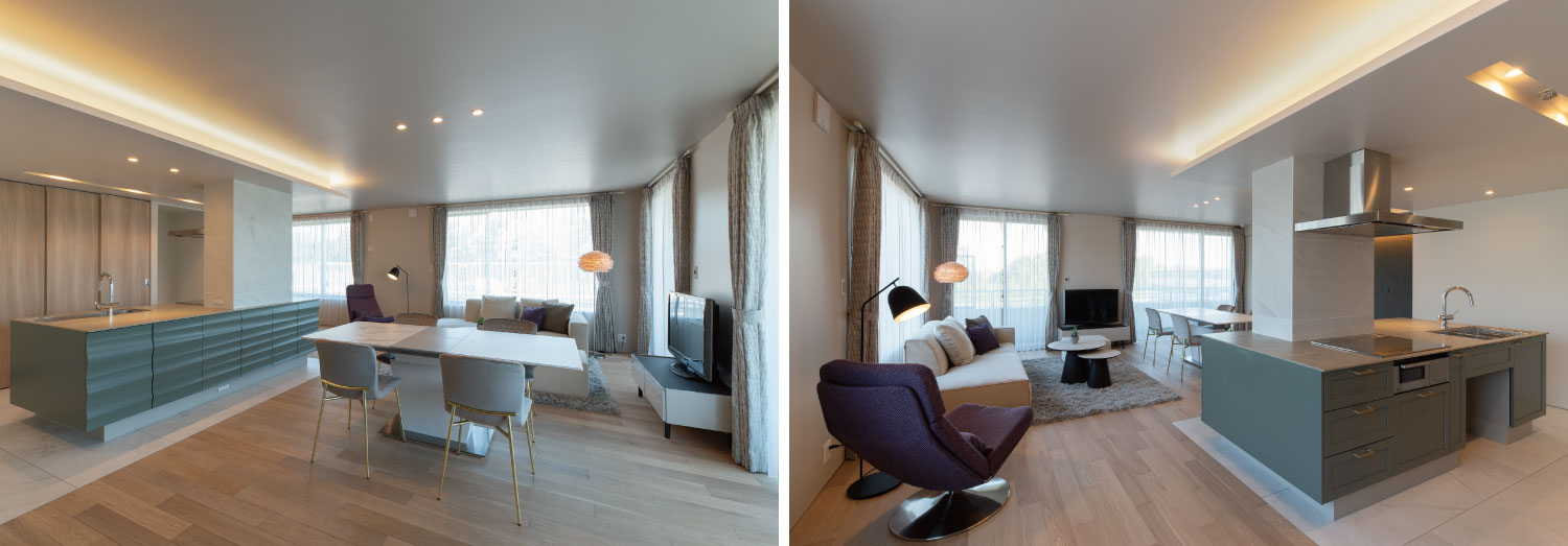 今回、お施主様のご厚意により見学会をさせていただくお宅は、都内の中でも交通の利便性が高く駅前には商店が立ち並ぶ賑わいのある街並みと、ゆったりとした住宅街が近く人気の高いエリアにあります。このエリアで、新築時に購入し住まわれていたマンションをフルリノベーションし2面採光の物件特徴を活かした開放感の高いお住まいにされました。