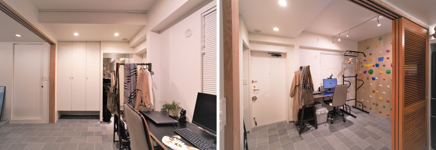 実例をご紹介すると、キャンプがご趣味のご家族の住まいで玄関にタイル敷きの広い土間空間を設け、壁一面をクライミングウォールに。キャンプから帰宅後、テントなどのお手入れも出来る十分な広さになっており、床がタイルのためお手入れ後のお掃除もしやすくなっています。LDK空間とは3段引き戸で仕切っているので、普段はワークスペースとしても活用できるなど、複数の使い方が出来る空間になっています。