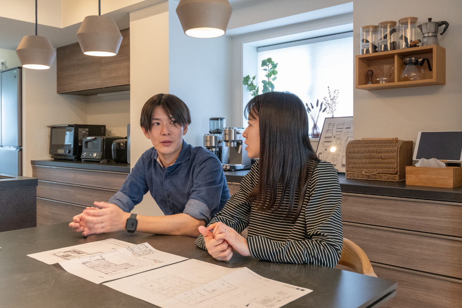 奥様:「やりたいと思っていることを全部言ってください」と言われたのが、印象的で記憶に残っています。私は家づくりについて、とてもこだわりが多く、間取りのことだけでなくテレビは壁付けにして配線を隠したい、ダイニングテーブルはキッチンに横付けしたい、収納はたっぷり設けたい等、細かな要望も思いつく限りお話しました。