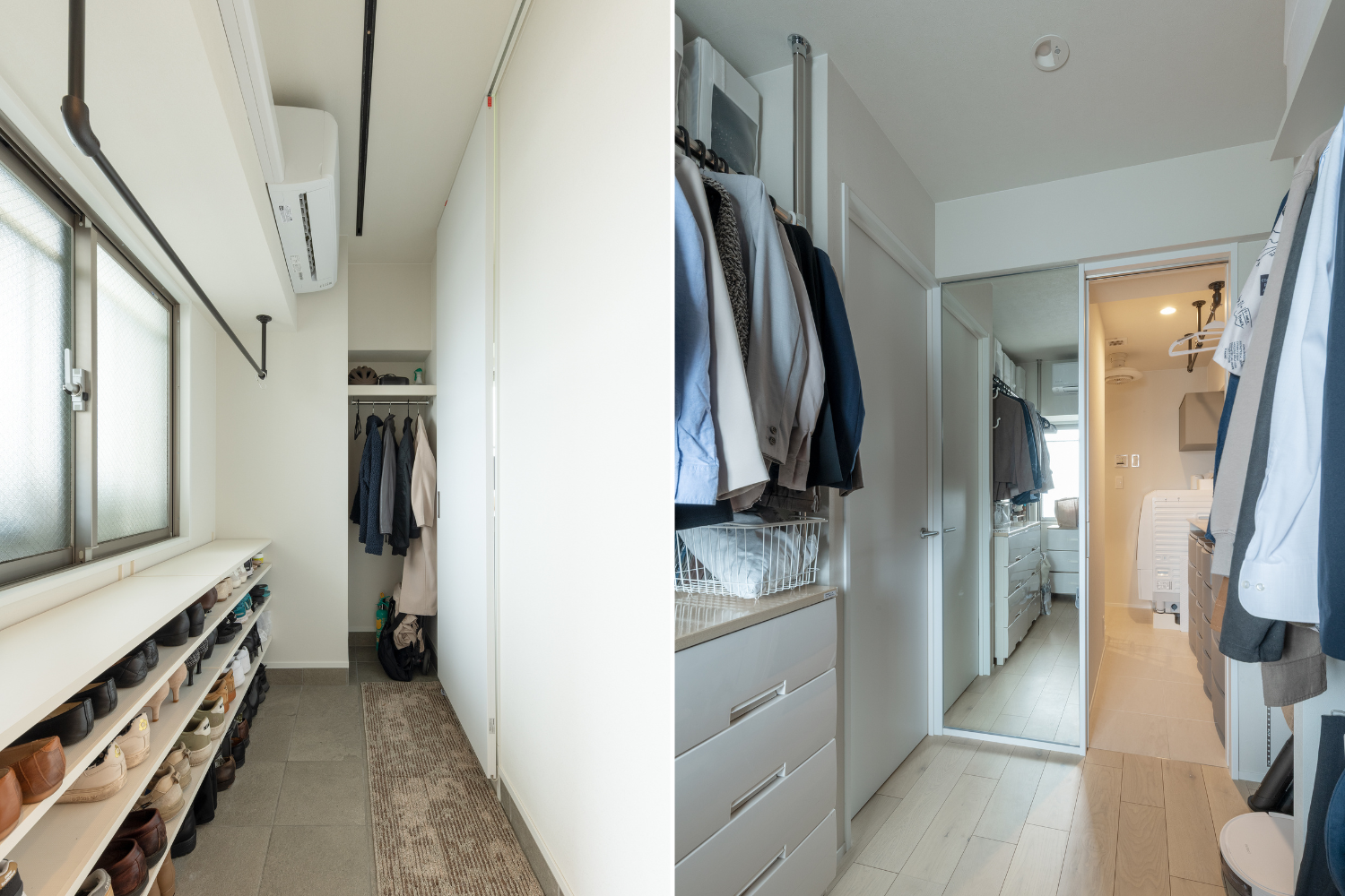 奥様:玄関に洗面台があるので、子どもに帰宅時の手洗い習慣を身につけさせやすく助かっています。廊下と兼ねることで洗面台の幅を広くとれたので、身支度も2,3人同時にできますし、脱衣室のスロップシンクも第二の洗面台のように使えます。