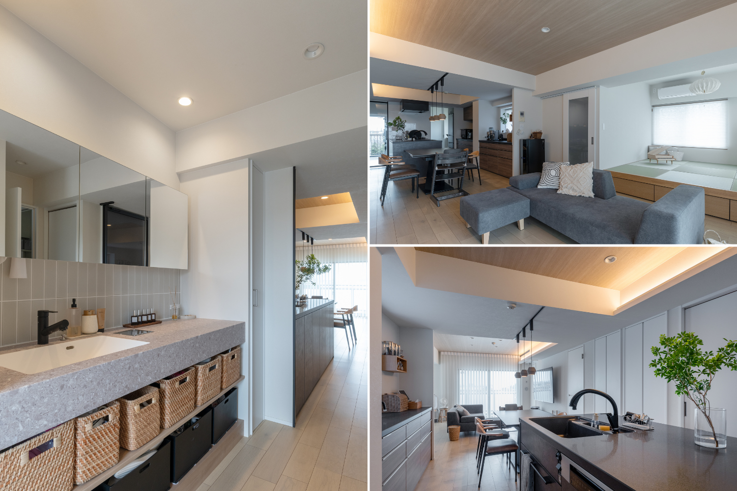 玄関を開けると現れるホテルライクな洗面台、リビングの中心にある大きなキッチン、収納を兼ねた小上がり、そして玄関からリビングまで1周できる回遊動線。自由設計のフルリノベーションならではのこだわりが随所に散りばめられた住まいを実現した、H様ご夫婦にお話を伺いました。