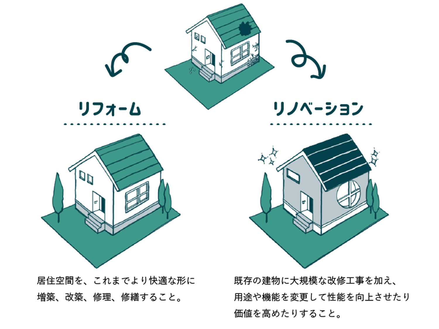 そのことから、古くなった建物を新築同様の状態にすることをリフォーム、既存の建物に新たな価値を持たせることをリノベーションと定義しているようです。