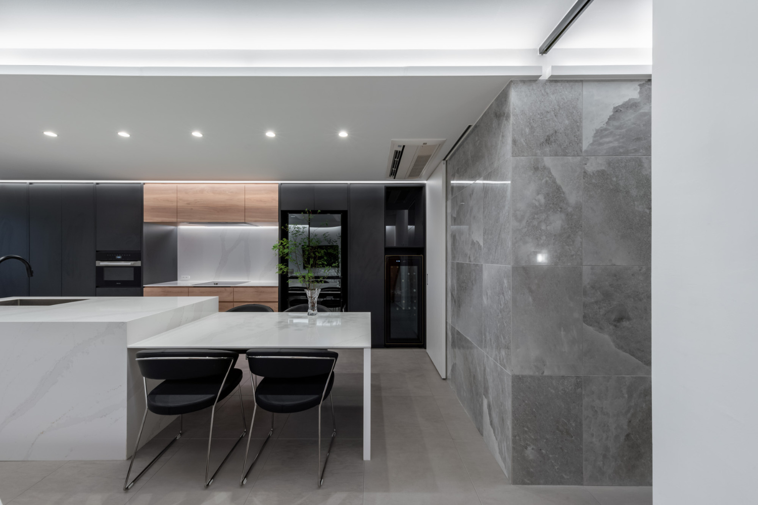 白を基調とした外観から、グレーを効かせた重厚感あるデザインへと刷新した戸建てフルリノベーション実例です。門塀やアプローチタイルも新たに設け、外構から印象を一新しました。1階子世帯は間取りは変えず、白を基調としたシンプルなデザイン空間に。2階親世帯は水廻りを再配置し、タイルや照明で統一感をもたせた開放的な空間に仕上げました。玄関はあえてムーディーに設え、外観・内観ともに品格ある佇まいを実現しています。