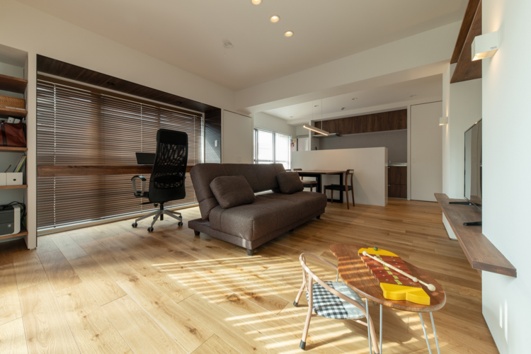 第二子の誕生を機に、安心して子育てできる住まいを求め、約80㎡の住戸をリノベーションされた実例です。コンセプトは「明るいワンルームで、スッキリ暮らす」。キッズスペースとLDKは、収納機能を備えた間仕切りで緩やかにゾーニング。回遊性のある家事動線や引き戸の工夫で、開放感と来客時のメリハリを両立しています。大開口からの光を活かすバーチカルブラインドや、キッチンまわりの収納計画など、快適さと美しさを兼ね備えた住まいです。