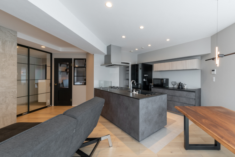 理想のエリアで注文住宅を見据えたご夫妻が選ばれたのは、「中古マンション+リノベーション」。条件にあった土地探しに時間がかかることから、将来的に売却を前提に、それまでの間も機能的で高いデザイン性の空間に住めるようマンションリノベを決断されました。三角形に近い住戸形状を活かし、LDKにはペニンシュラキッチンとパントリーを設けて空間を有効活用。視界が抜けるガラスドアで、開放感も確保しました。廊下のない回遊動線を描き、暮らしやすさにもこだわりを。収納や書斎など、夫婦それぞれの要望を反映した唯一無二の空間が完成しました。