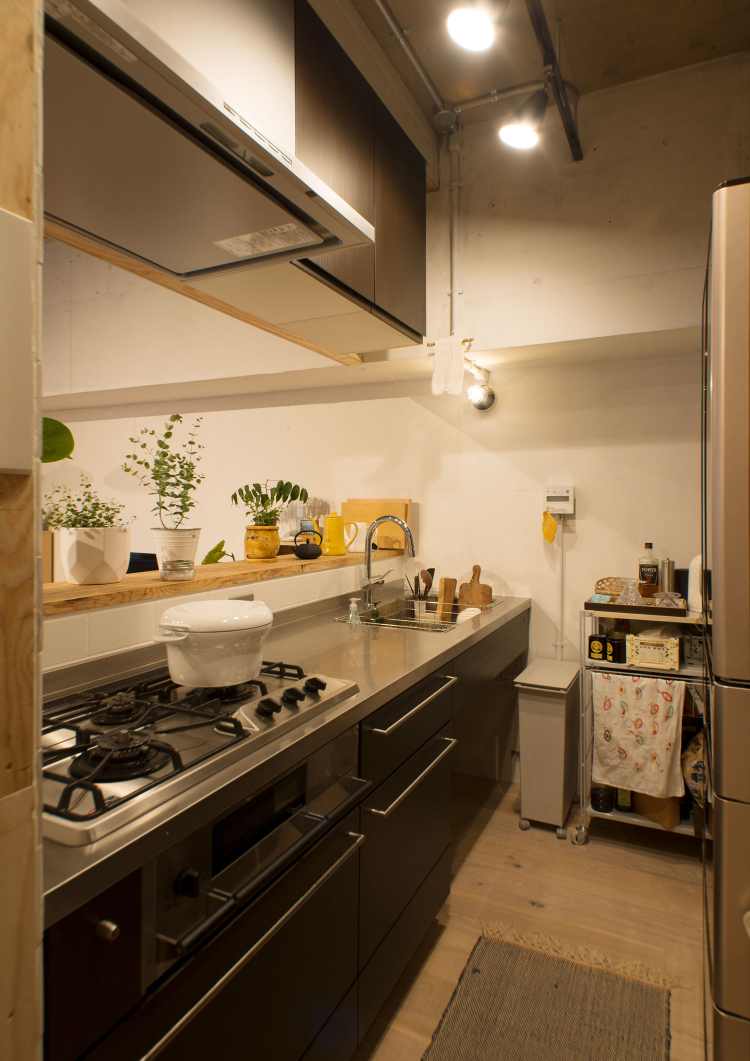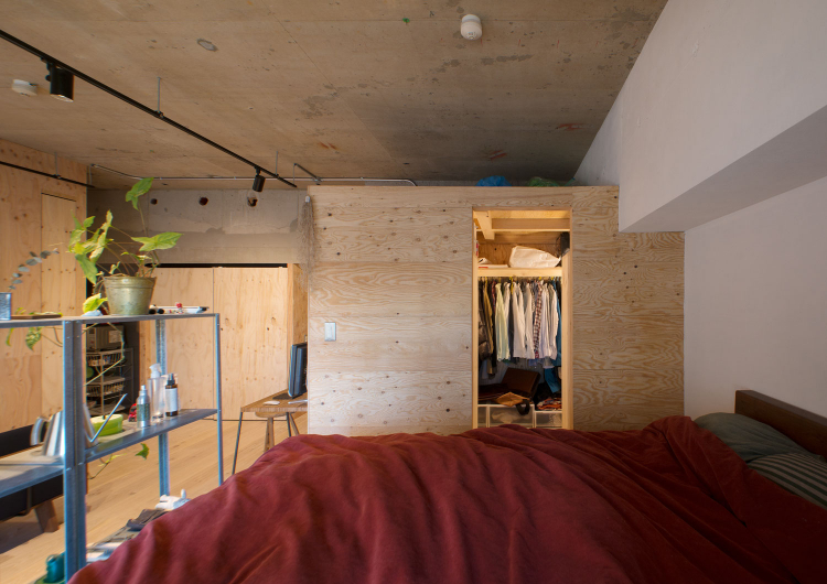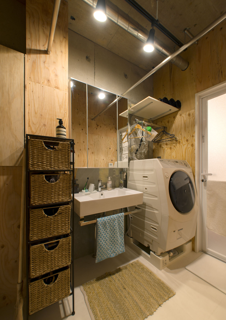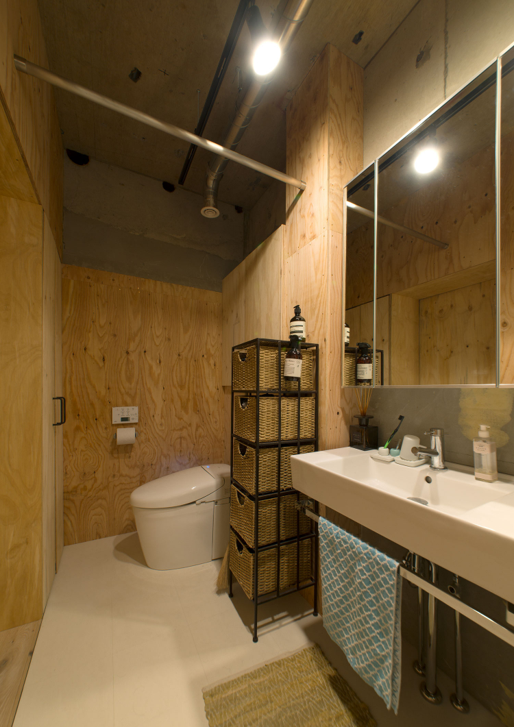 一見、無機質にも思える空間ですが、下地材でよく用いられる、針葉樹の合板をアクセントとして採用。「コンクリートの肌と木の質感が好き!」というお客様のイメージをもとに、無機質ながらも木の質感も調和した、お施主様ならではの住まいに。