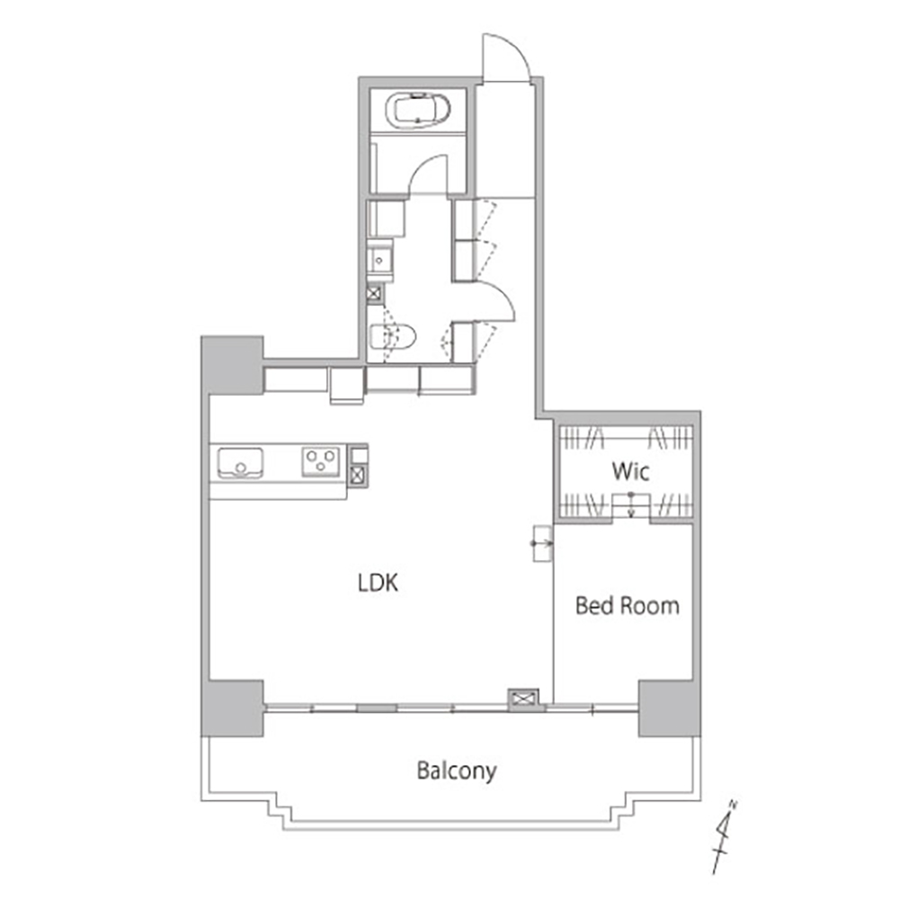 収納計画では、空間を損なうことなく十分な収納スペースを確保。ベッドルーム脇に広いウォ―クインクローゼット、玄関からLDKまでの廊下壁、キッチン裏など、一体に繋がる空間でありながら、凹凸のない自然な収納スペースを設けています。