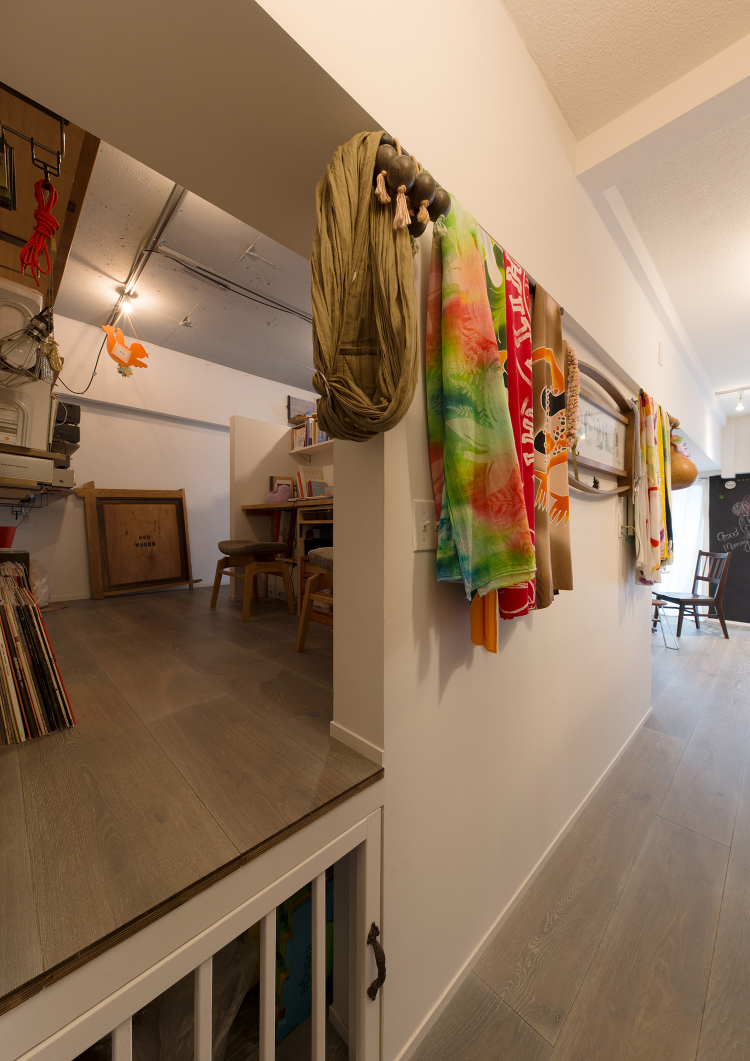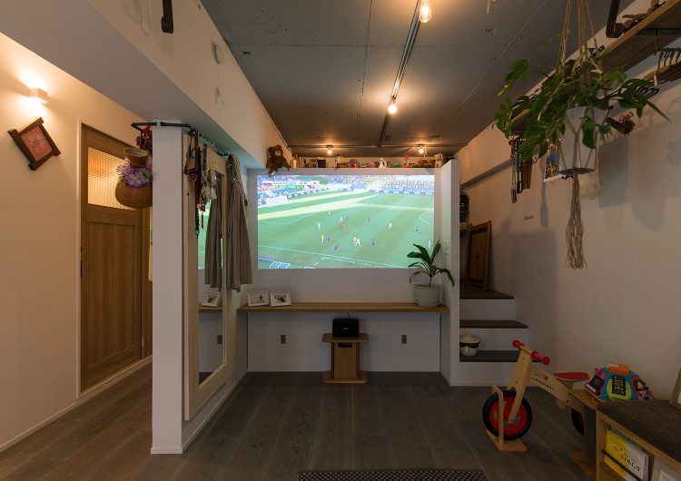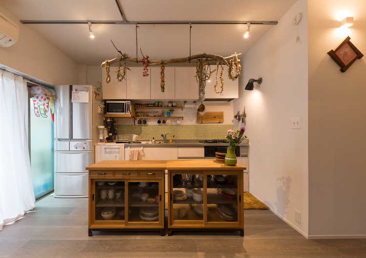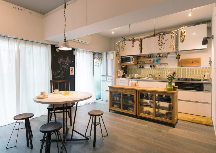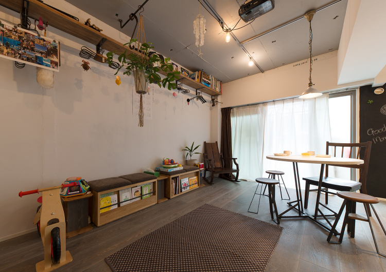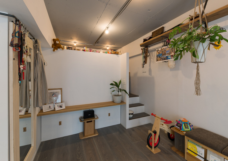 こちらのリノベーションの大きな特徴は、家具デザイナーであるご主人様とリデザインの設計者のアイディアを組み合わせたプランニング。中でも、リビングでは普段の生活に加えて、フラダンス講師をされている奥様の練習スペースを両立する間取りを計画。スペースを確保するために、『収納できるテーブル』を造作し、リビングとしての表情と練習スペースとして表情を切り替えられる設計にしています。また、テーブルを収納することで生まれるスペースで、お子様がのびのびと遊べる点も魅力のひとつです。