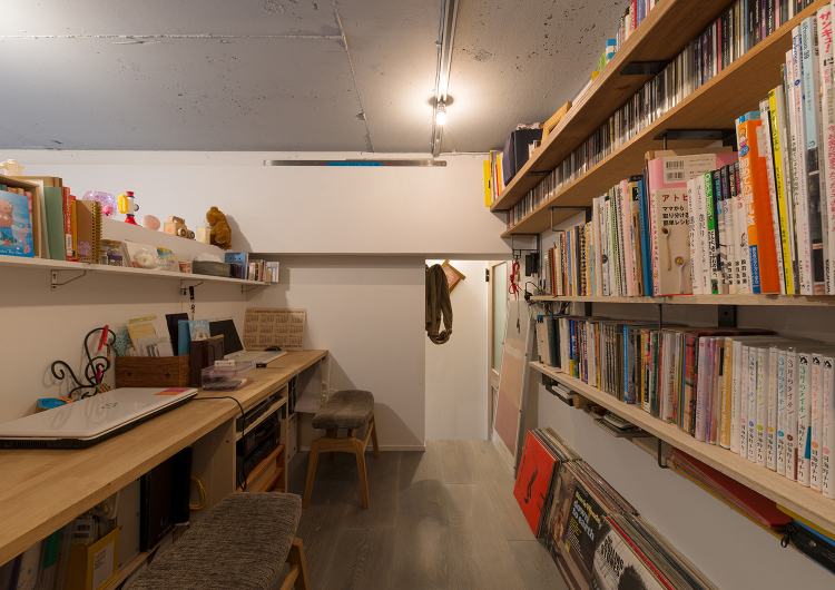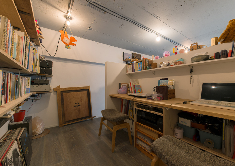 ご主人様と奥様の作業場として、リビングから小上がりになった空間も用意。リビングとの間に壁を一枚挟むことで半個室のような空間に仕上げつつも、天井近辺はリビングと繋がるように設計することで、ご家族の気配を常に感じられる造りとしているところもこだわりです。