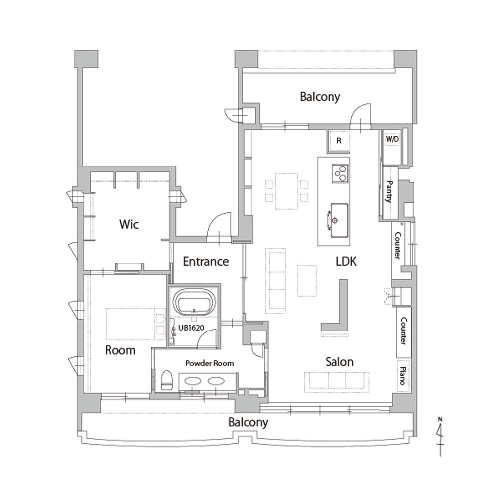 こちらのリノベーションでは、回遊性のあるプランを計画。玄関から入り、まずはLDKへ。そこから、天窓から明るい光が差し込むサロンスペースを経由して、洗面室、主寝室、WICの流れで室内を1周できる動線を描いています。