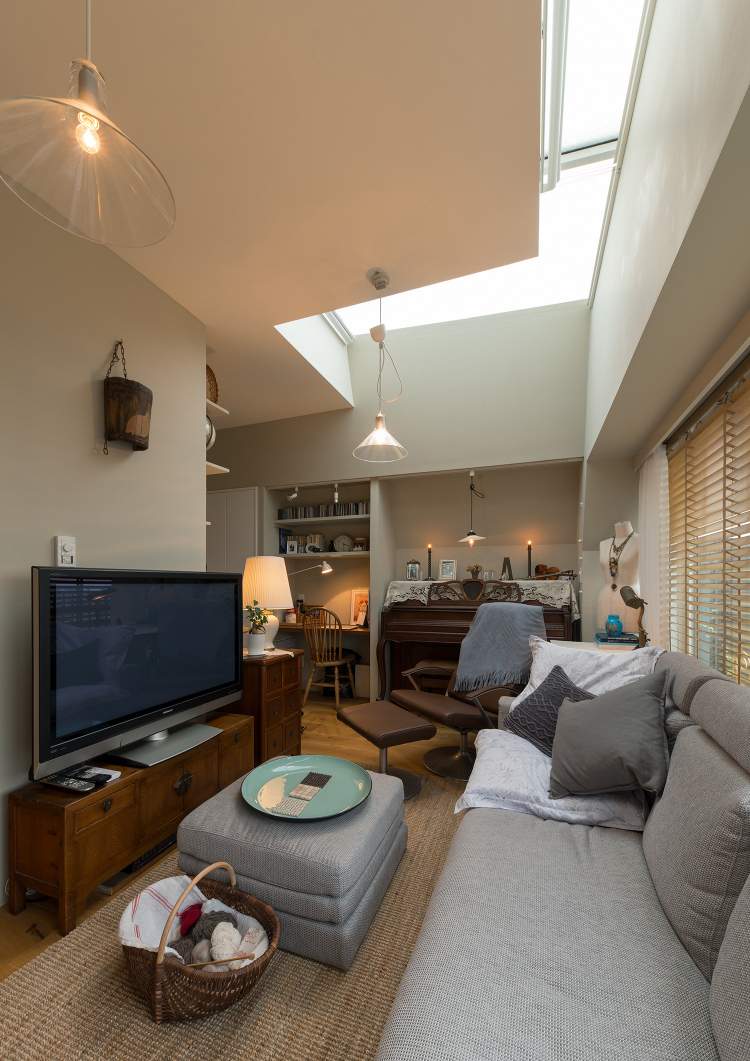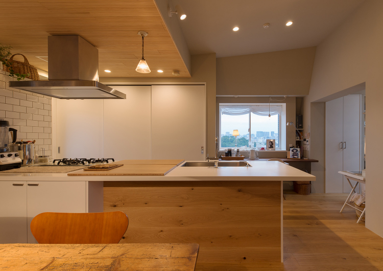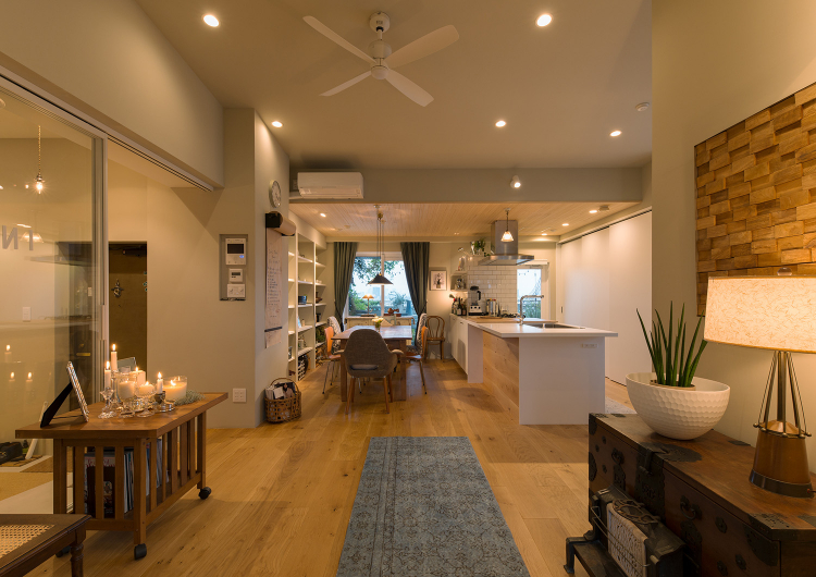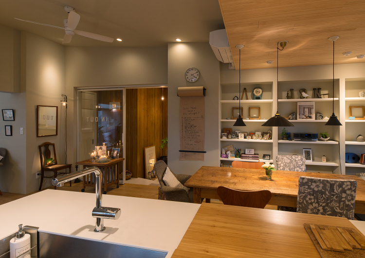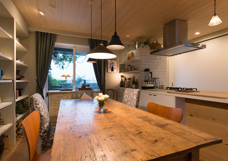 インテリアコーディネートでは、家具屋でお勤めだった奥様のこだわりを反映。もともと小物などを集めて飾るのが好きだったということもあり、各空間に様々な表情を与えています。中でも、キッチンの前に配置したダイニングテーブルは、パインの古木材で作られており、長年蜜蝋でメンテナンスするなど、ご夫妻が多くの時間を共有する家具としての風合いが現れています。
