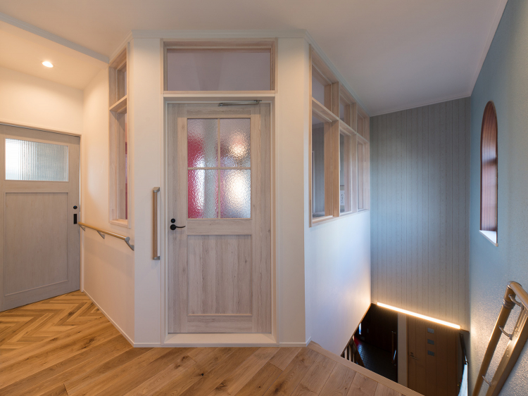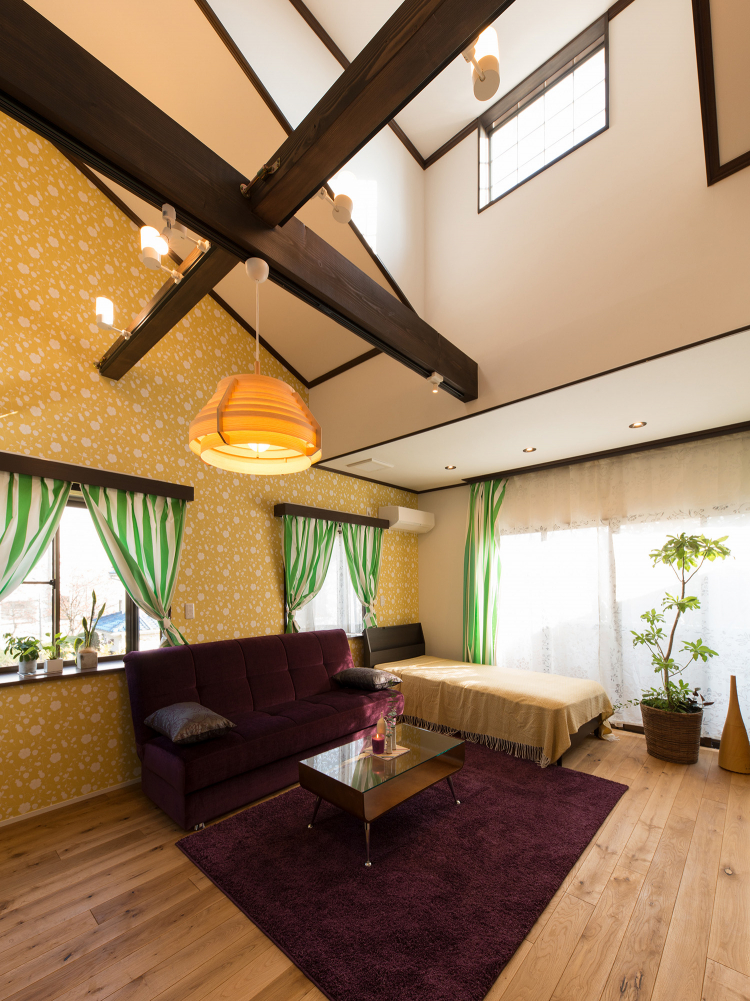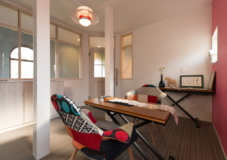 2階では、親戚にのんびりとくつろいでもらいたいとのご要望で、子供部屋と書道教室の混在していた洋室を、ゲストリビングに改装。勾配天井を活かし開放感のあるデザインで仕上げています。書道教室は、使用されていなかったミニキッチンと広い階段廊下ホールに計画。通り間を設けることで、パブリックスペースを独立させた造りにしています。採光を得るために設けた内窓や、生徒の年齢層に合わせピンクをアクセントカラーに設けるなど、明るい学の空間になりました。