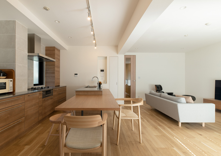 LDKでは、ゲストルームにもなる和室を隣接させ扉を引き戸にすることで、LDKに拡がりを創出しています。キッチンは機能面にこだわり、セパレート型でダイニングと一体にしたダイニングキッチンに。木調の柔らかな印象のキッチンに、造作でダイニングテーブルを設け、ナチュラルテイストで仕上げました。テラスから入る豊かな光と合わさり、家全体に暖かな雰囲気を届ける存在になりました。