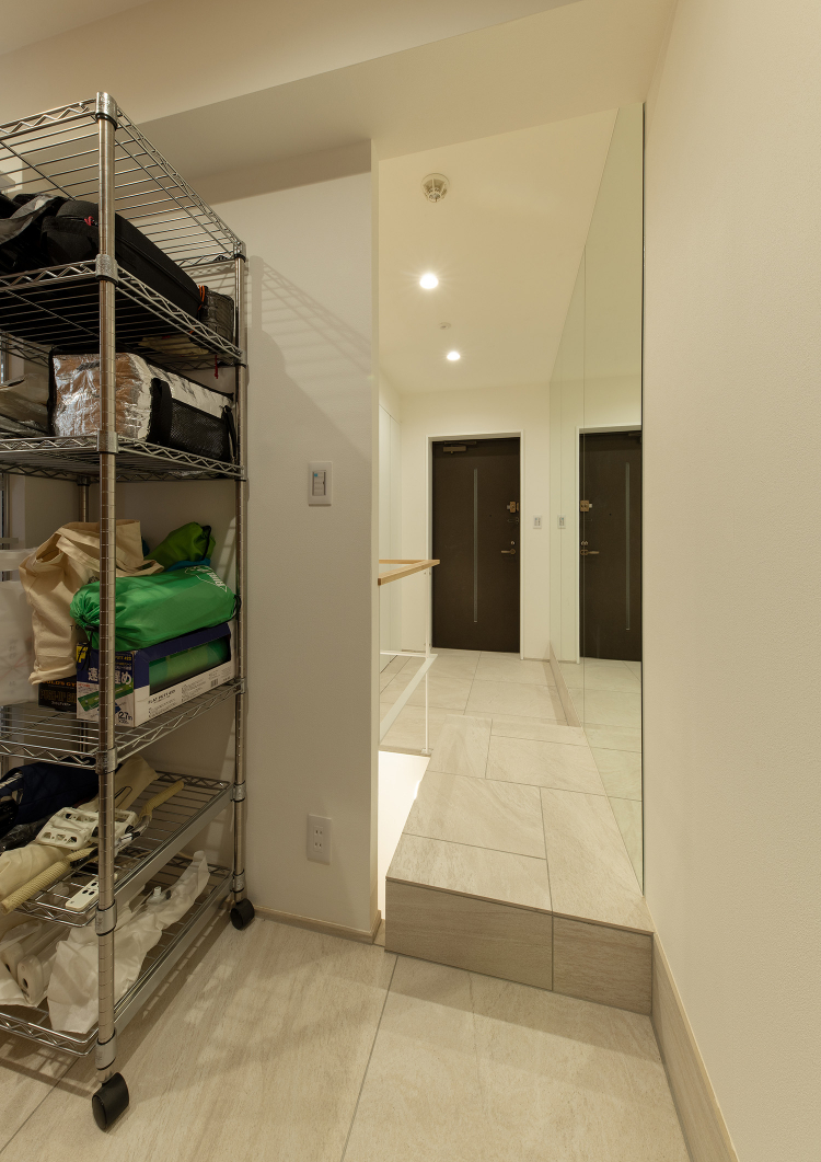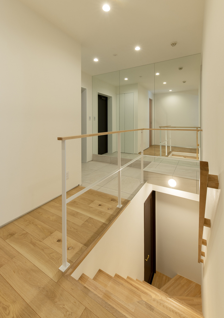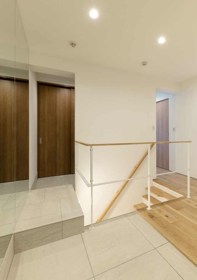 そこで、注目したのが元和室をSICにし、階段室に橋を設けたアプローチ方法を計画。こうすることで、玄関脇にあった洋室をWICとして広く取れ、目的に沿った収納スペースの配置計画と、無駄のない動線計画を両立。平面的ではなく、立体的に空間の検討を重ねることで導かれたプランになりました。また、開口がなく視線の抜けがないエントランスの壁一面を鏡にすることで、窮屈感を解消させています。