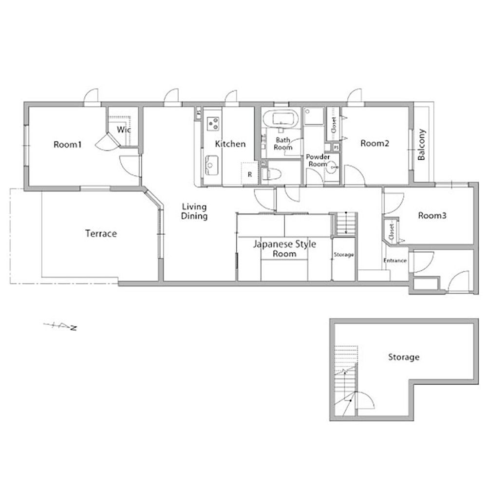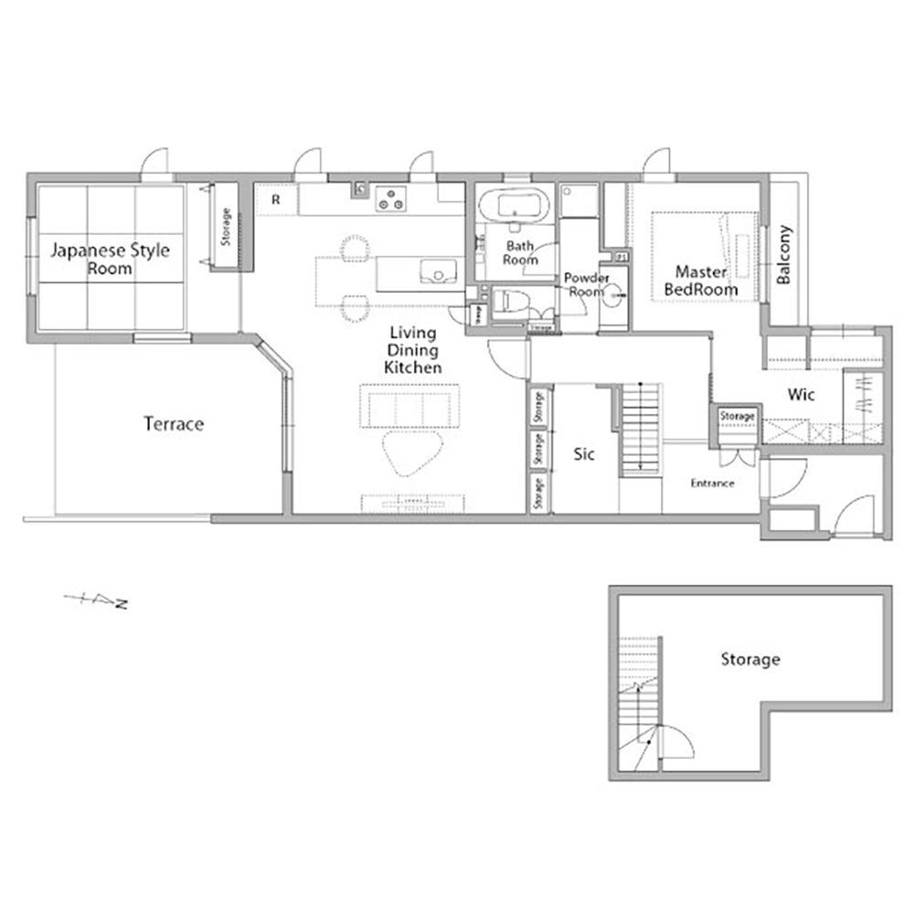2LDKで広いリビング、収納を充実させた住まいを叶えたいということで、お二人が購入されたのは、100㎡以上の広い住戸。しかし旧間取りでは、玄関正面に階段室があるメゾネット型になっており、窮屈感を感じる造りでした。また、玄関付近の収納スペースが少なく、ゴルフバッグや靴などの収納としてはスペース不足。しかし、SIC兼WICという形でまとめてしまうと十分な収納量が確保できず、収納量を鑑みるとWICを別の場所にもう一つ設ける必要がありました。それでは、生活動線の快適性が損なわれることになってしまうため、SICとWICは切り離すプランで検討しました。