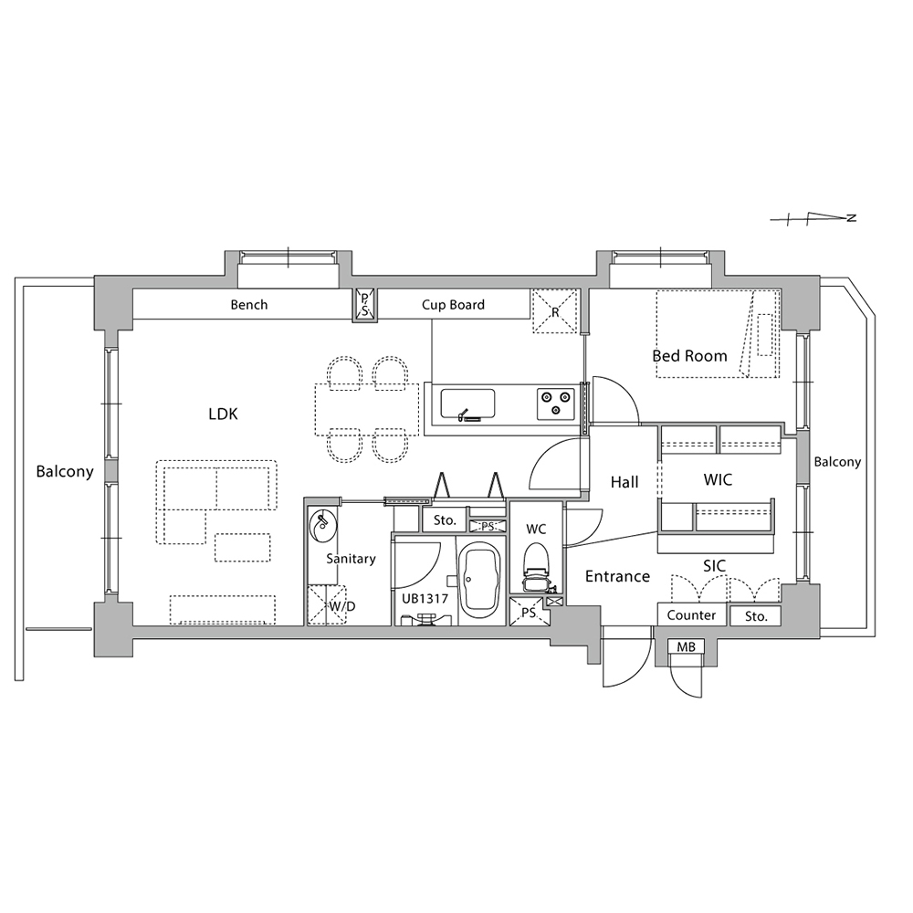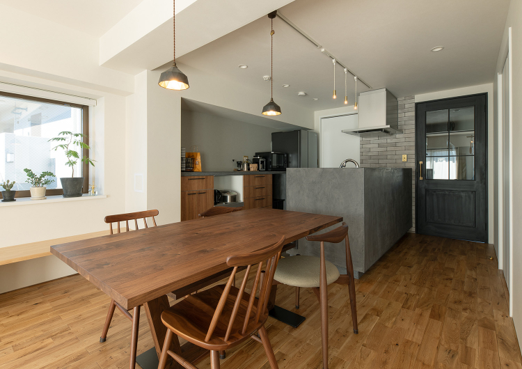 お二人が購入されたのは、約64㎡の住戸。将来、お子様が誕生されても大きくなるまでは、一部屋で暮らす想定をされていたため、1LDKでの計画としました。空間づくりの中で頂いた要望は、インダストリアル系のデザインとご主人様こだわりの靴をディスプレイ出来る広い玄関、コミュニケーションの取りやすいキッチンです。