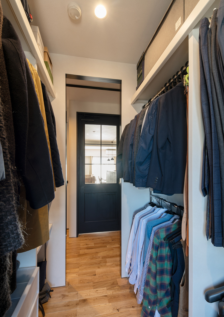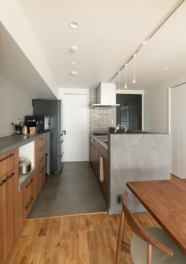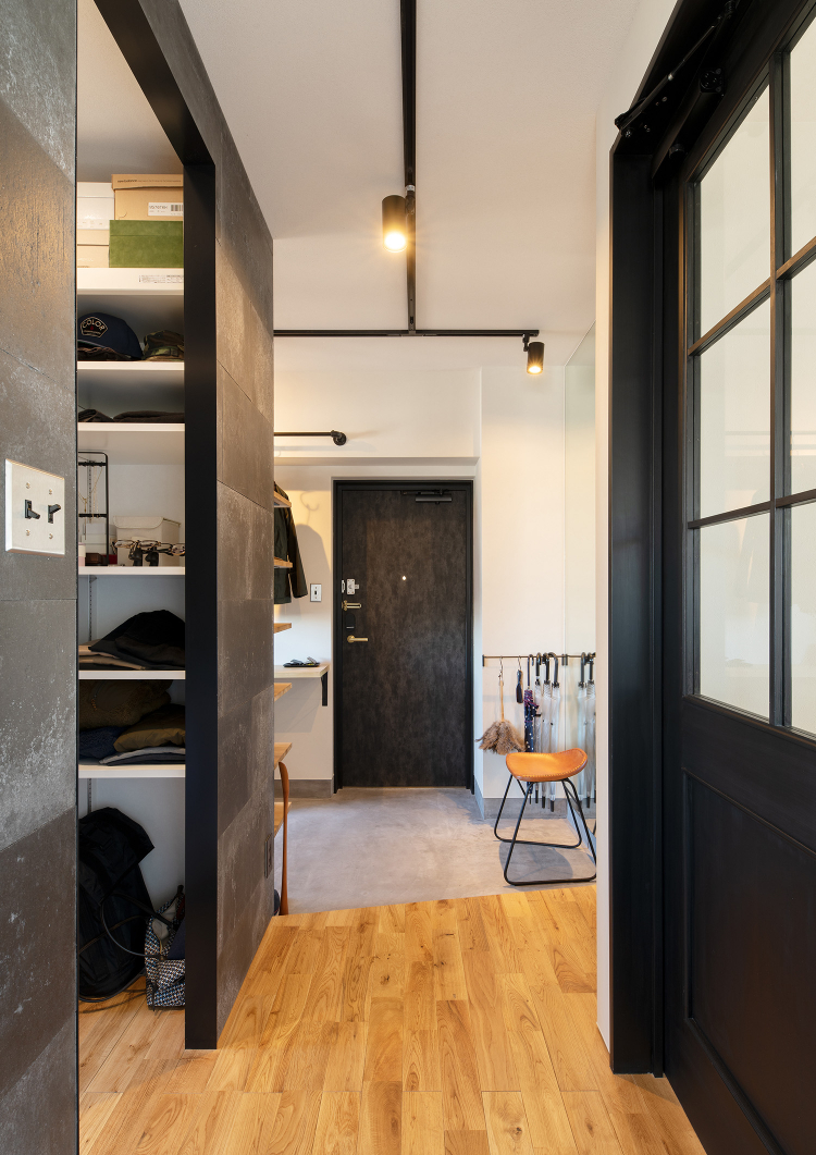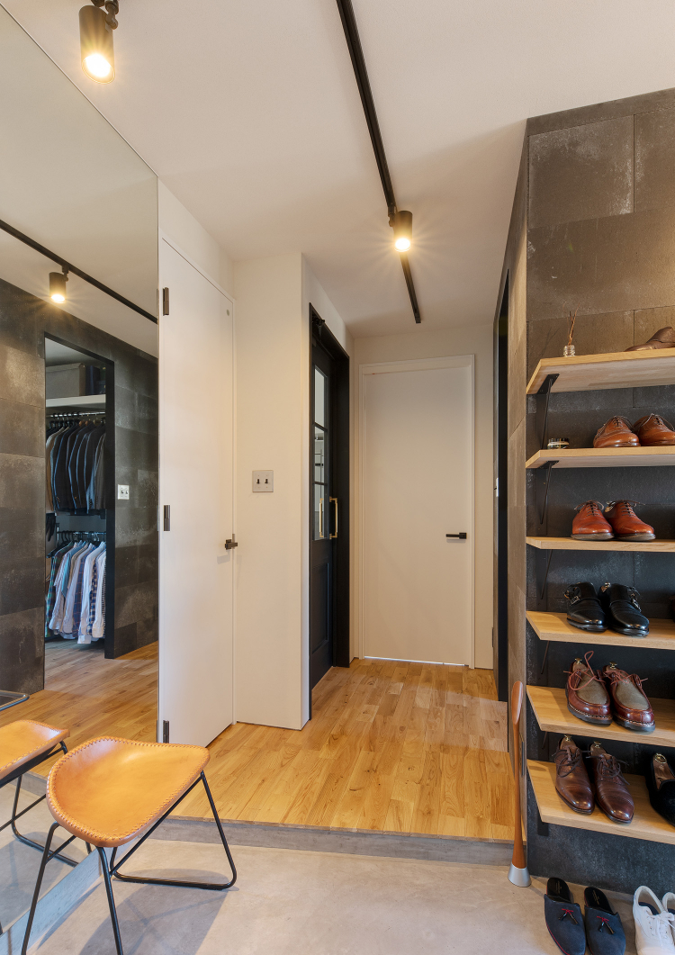 デザイン面では、WICとSICとを仕切る壁を、鉄黒で質感のあるマテリアルで仕上げたアクセントウォールがインダストリアルな印象を高めています。また、SIC側にオーク材で棚を設け、靴をショップのようにディスプレイ出来るように仕上げました。また、キッチンカウンターを、ひび割れないデザインコンクリートの「モールテックス」で仕上げ、インダストリアル系のデザインで住戸内のデザインに統一感を持たせました。