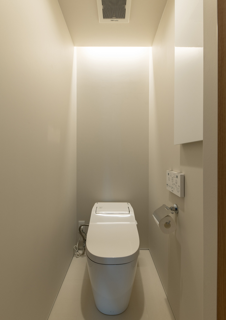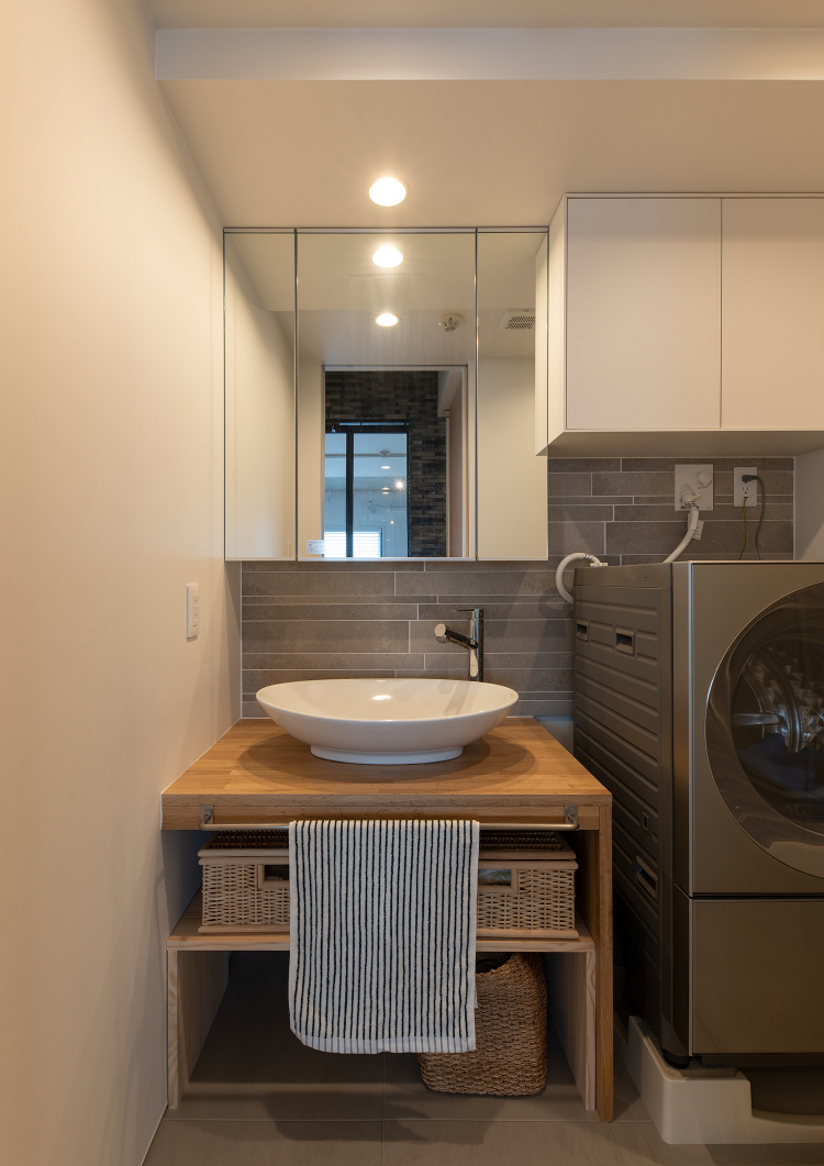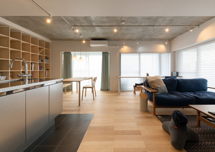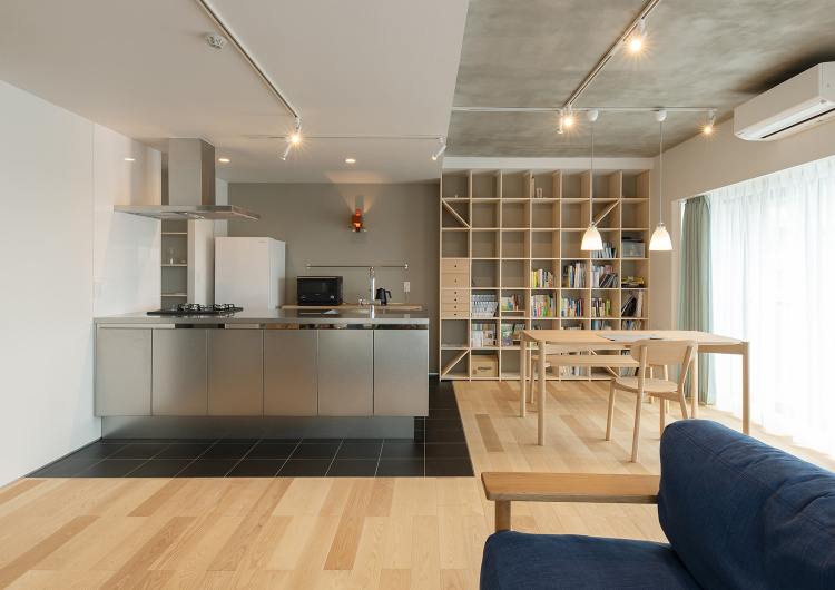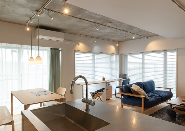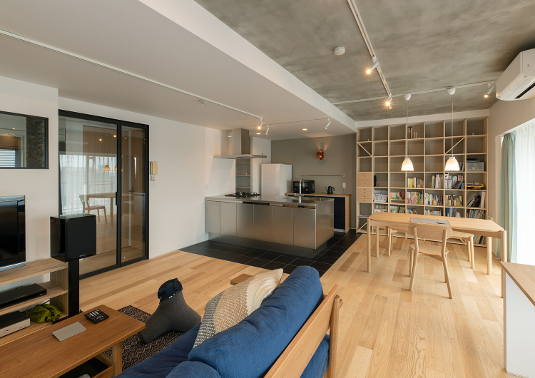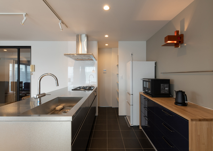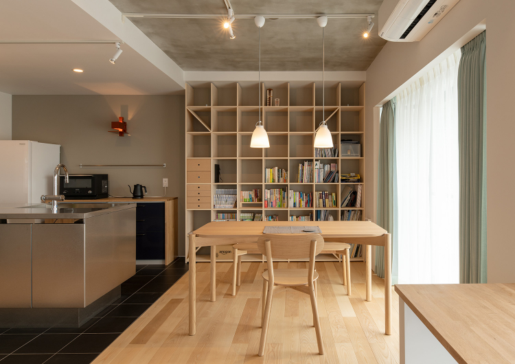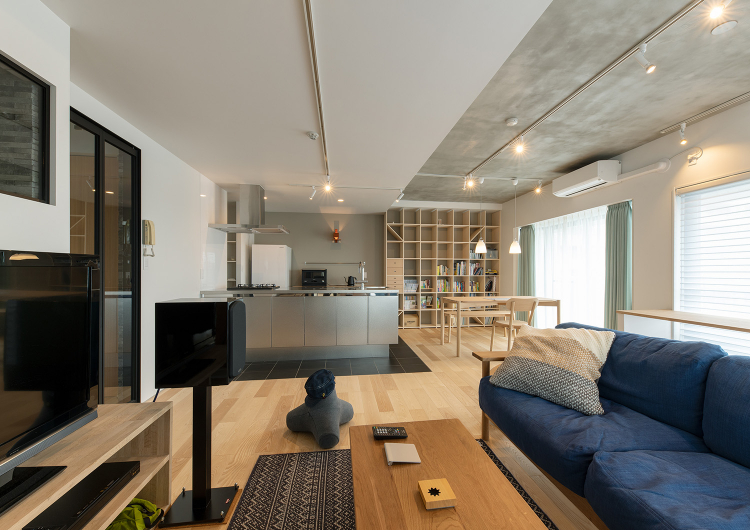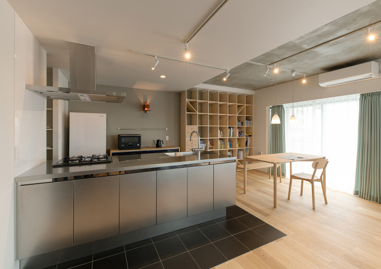 まずキッチンには、メンテナンスのしやすいステンレスキッチンを採用し、お好きなお料理時間を満喫できる空間に。ダイニング空間には、読書を楽しむための壁一面の本棚を設えました。こちらの本棚は、造作にするとコストが上がるため既製品を採用し、天井高さを調整することで造作したような造りで仕上げています。リビング空間では、テレビ廻りのオーディオ配線やLAN配線を、音楽や映像鑑賞が快適に楽しめるよう計画。また趣味だけでなく、仕事用に窓向きのワークカウンターも配備し、自宅にいながらカフェのような気分で仕事ができます。