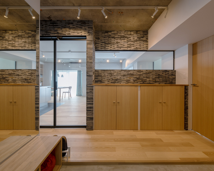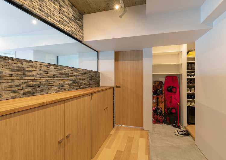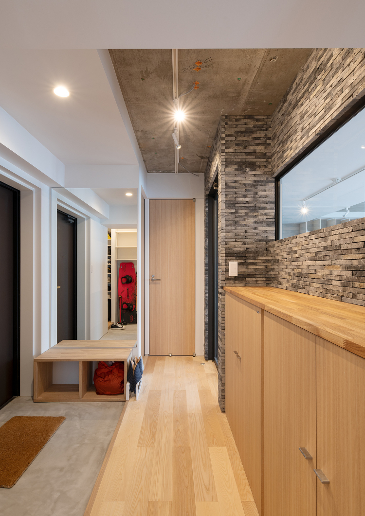 そこでリノベーションの舞台に選ばれたのは、約71㎡のゆったりとした広さの住戸。物件の広さをダイレクトに感じられる広く明るい玄関土間を設け、スキー板を磨くにも十分な幅を確保。暗くなりがちな玄関ですが、ガラス戸や内窓を通してリビング越しに自然光を取り入れ開放感のある空間に。隣設して趣味の道具も収納できる大容量のシューズインを配置し、出し入れのしやすい工夫をしています。
