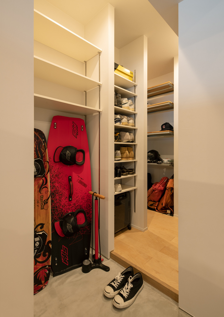 スキーやスノーボードなどアウトドアな趣味をお持ちのお施主様。自宅でも道具のメンテナンスができる広々とした空間を希望されていました。