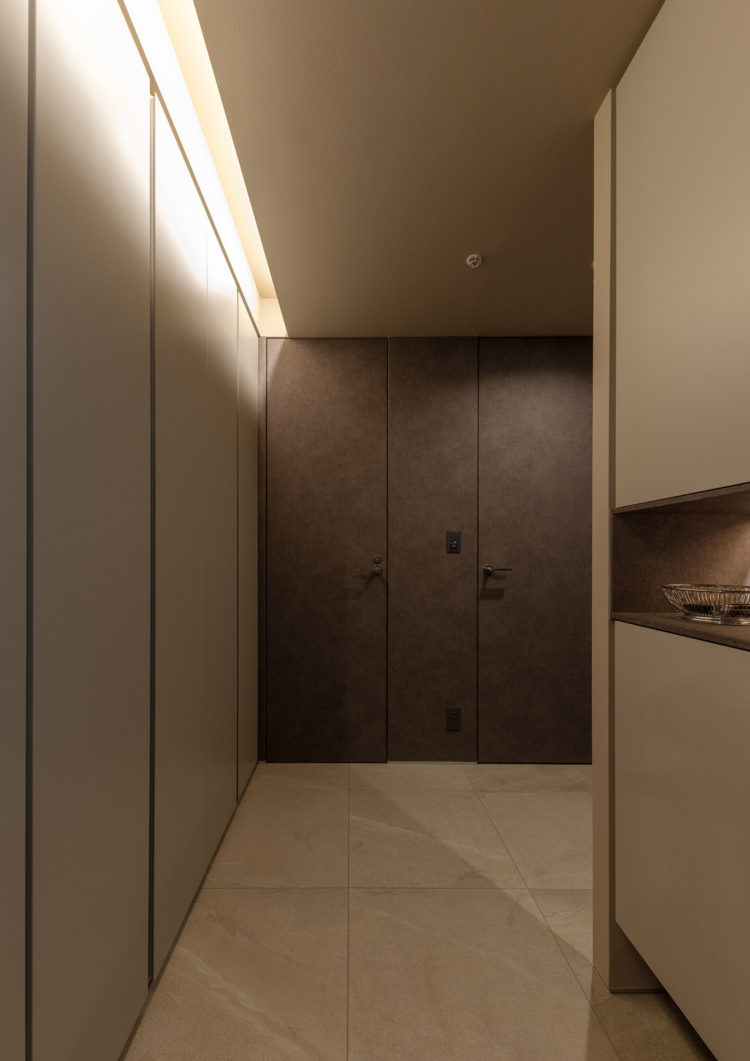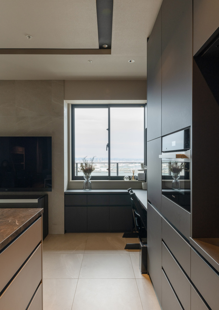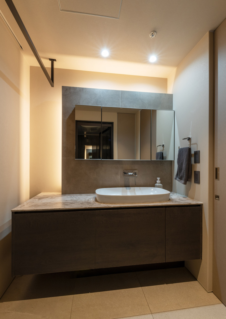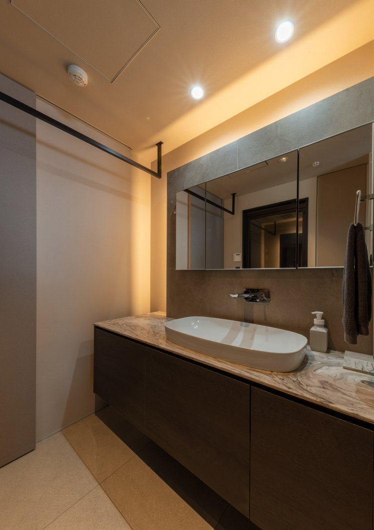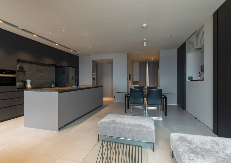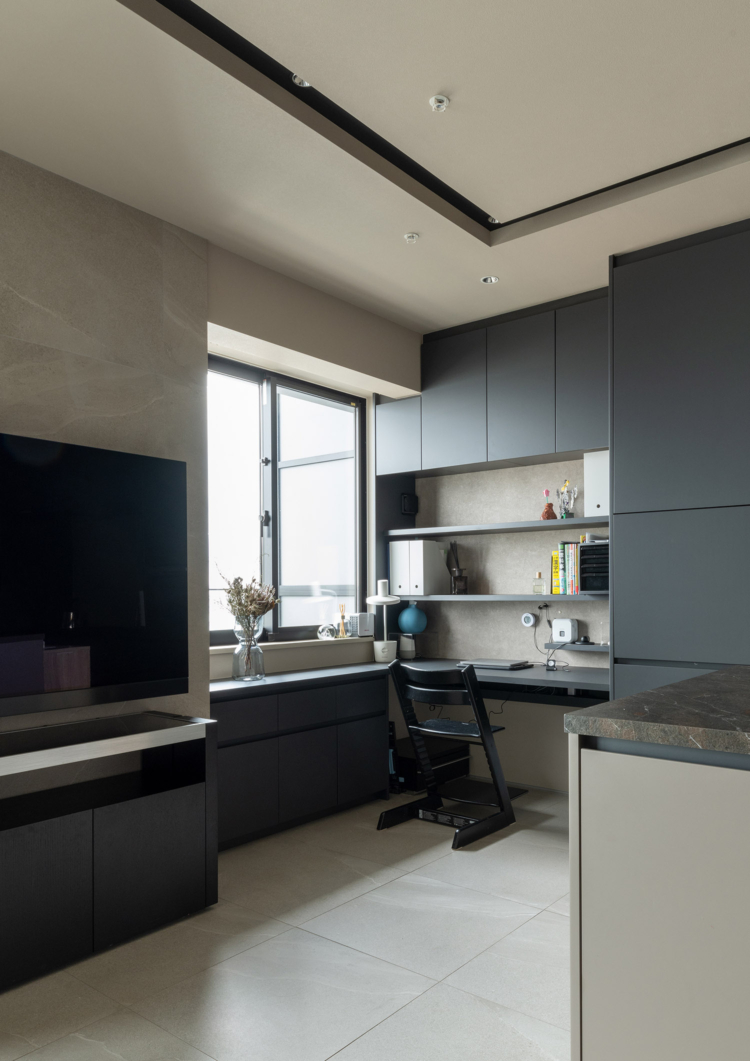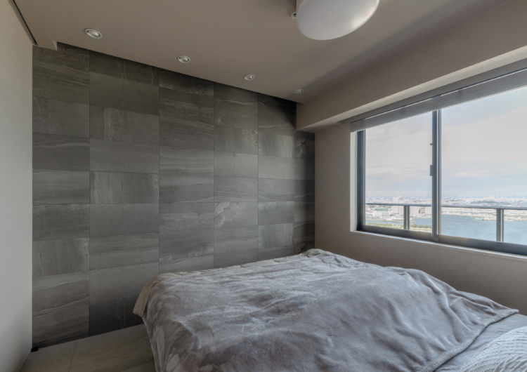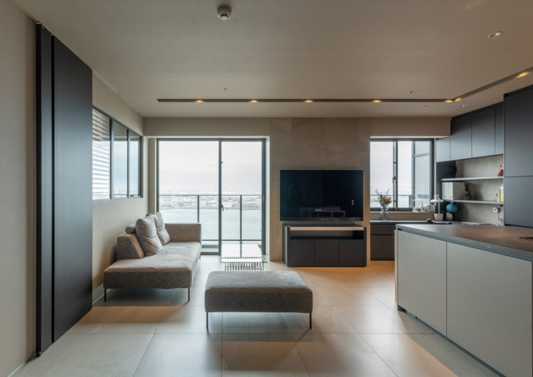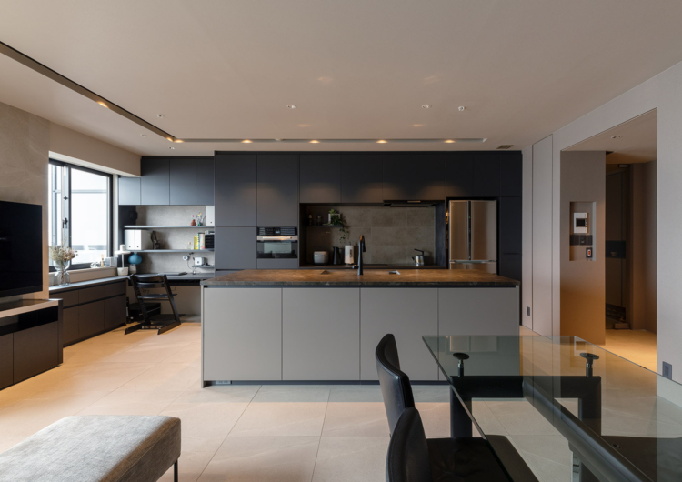 そこで、素材感を感じる上質なモダンデザインをデザインのメインコンセプトに、落ち着いた配色を基調としながらタイルやキッチンなどに石目の素材を用いて住戸全体に統一感を持たせています。それらのデザインの中に収納やエアコンなど生活に必要な要素を落とし込み調和させるようディテールを検討しました。間取り面では、眺望の良いバルコニーに面してLDKと寝室を配置。オーダーで仕上げたキッチンサイドには、キッチン収納とデザインを合わせたお子様のワークスペースを設け、ゆとりを持たせた収納計画にしています。