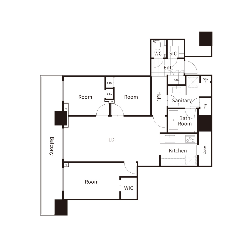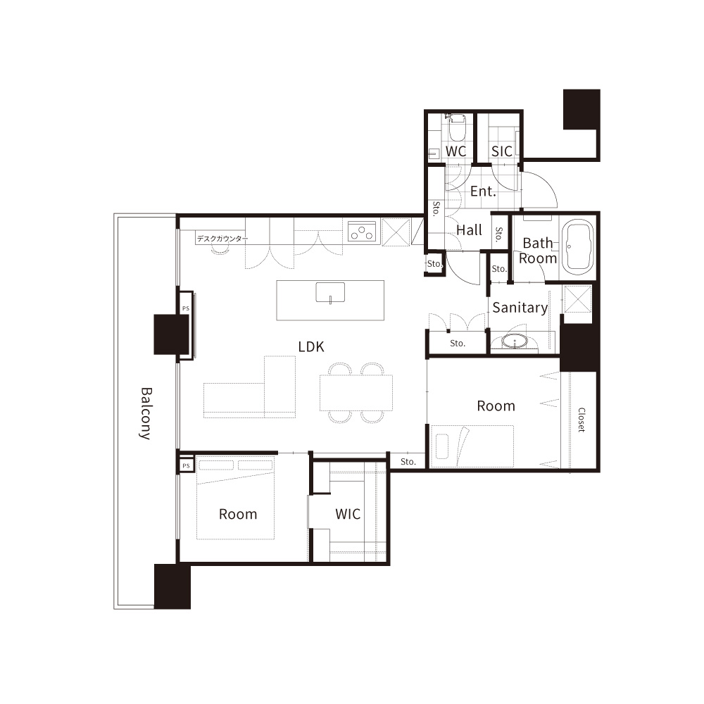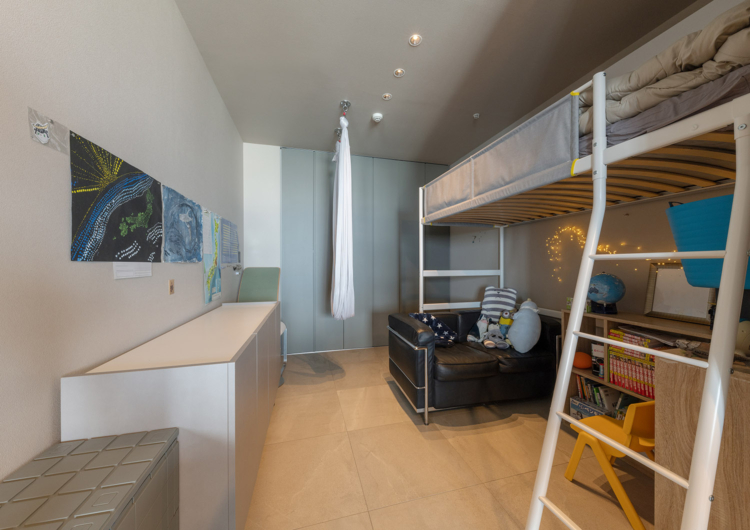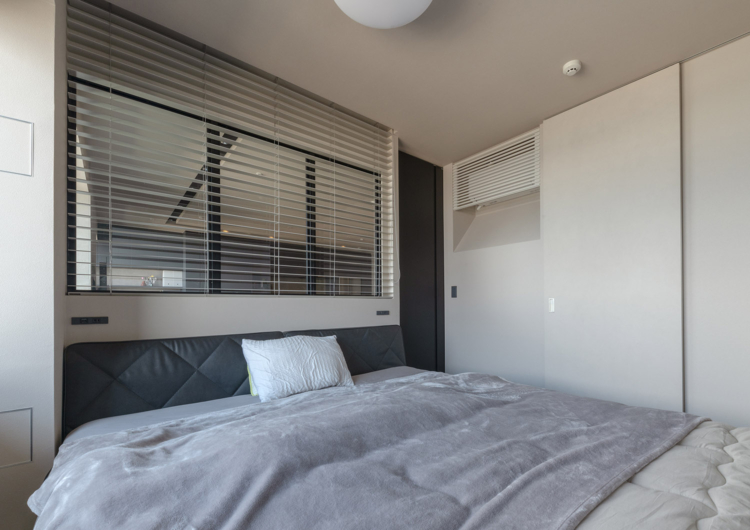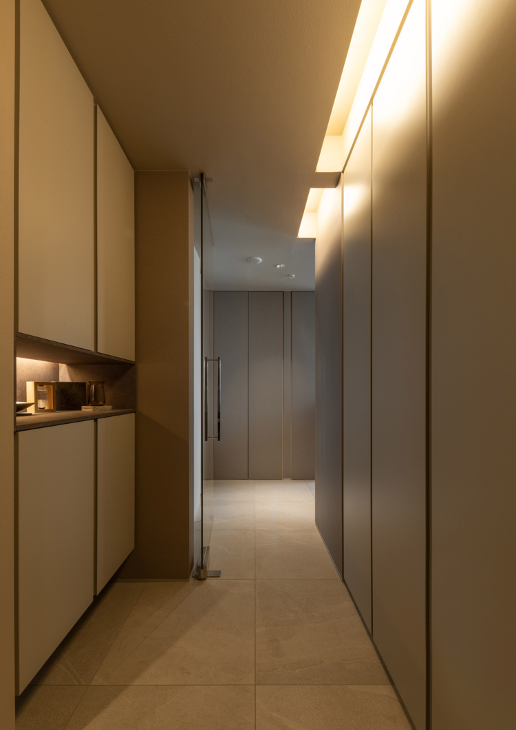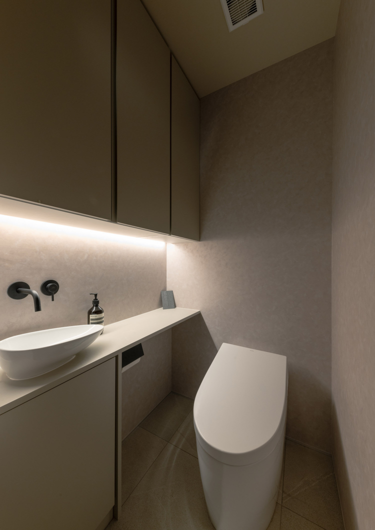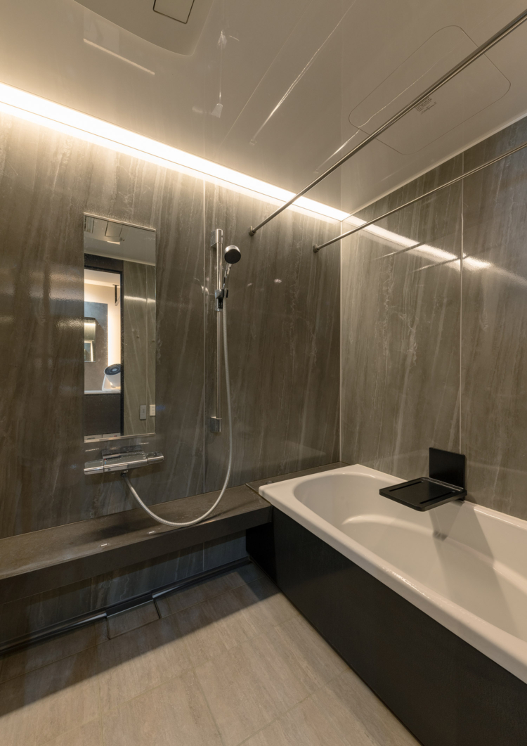 そこで、素材感を感じる上質なモダンデザインをデザインのメインコンセプトに、落ち着いた配色を基調としながらタイルやキッチンなどに石目の素材を用いて住戸全体に統一感を持たせています。それらのデザインの中に収納やエアコンなど生活に必要な要素を落とし込み調和させるようディテールを検討しました。間取り面では、眺望の良いバルコニーに面してLDKと寝室を配置。オーダーで仕上げたキッチンサイドには、キッチン収納とデザインを合わせたお子様のワークスペースを設け、ゆとりを持たせた収納計画にしています。