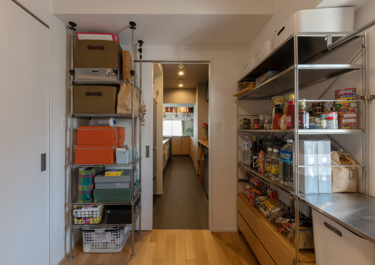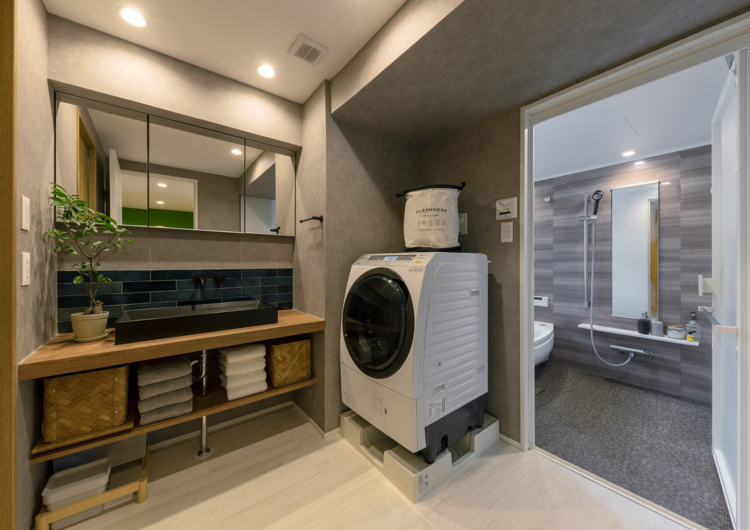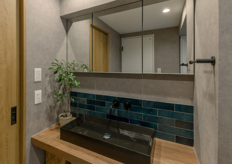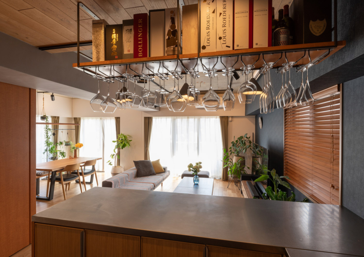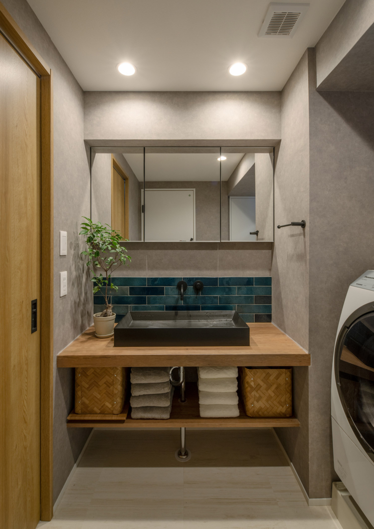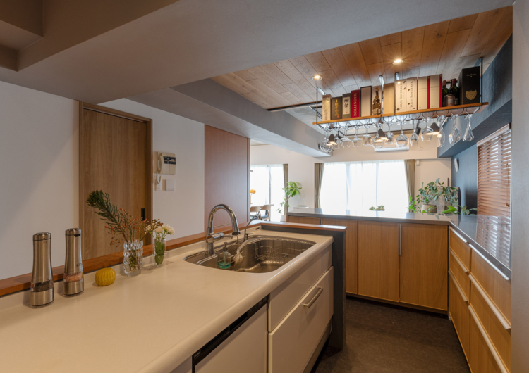 キッチンに隣接するバーカウンターや、使い勝手に合わせたデスクスペース、洗面台を、既製品ではなく造作によるオリジナル仕様で仕上げています。中でもこだわったバーカウンターは、キッチン空間全体と合わせて「ステンレス、集成材、黒アイアン、タイル」を使い、ほどよいカジュアルさのある大人な空間になっています。