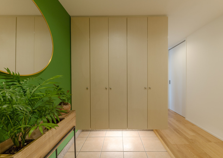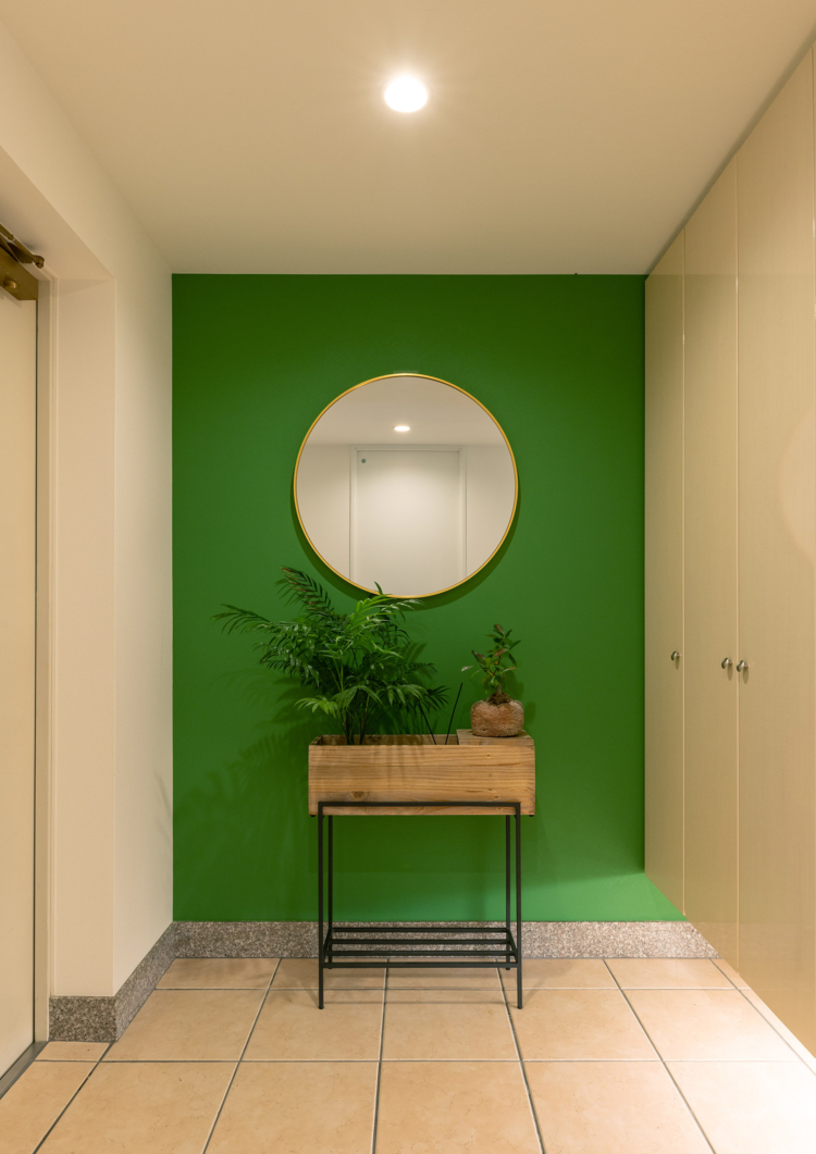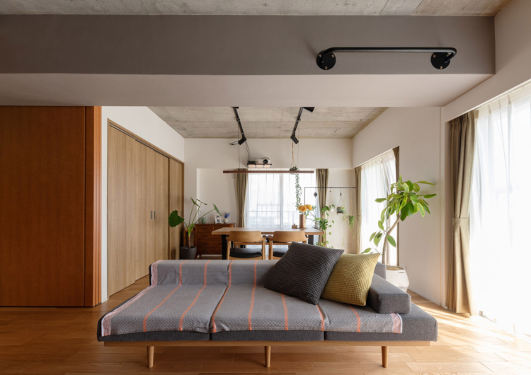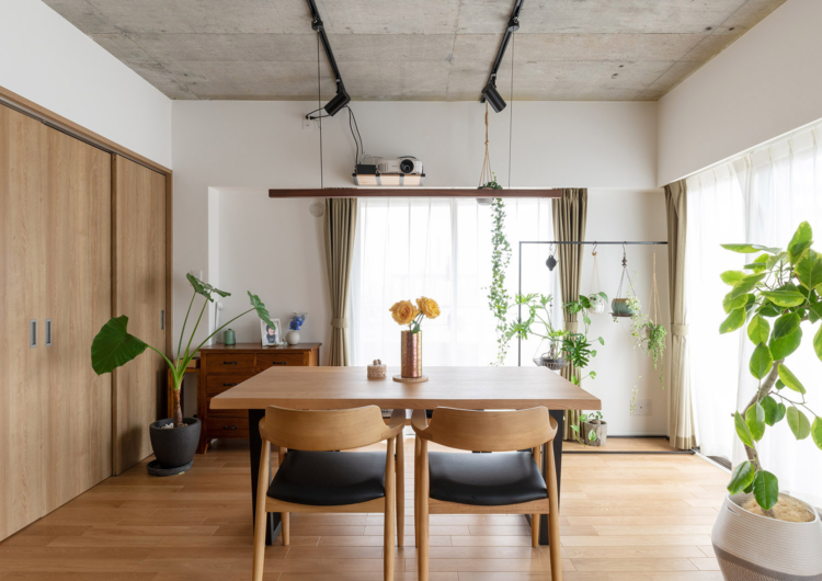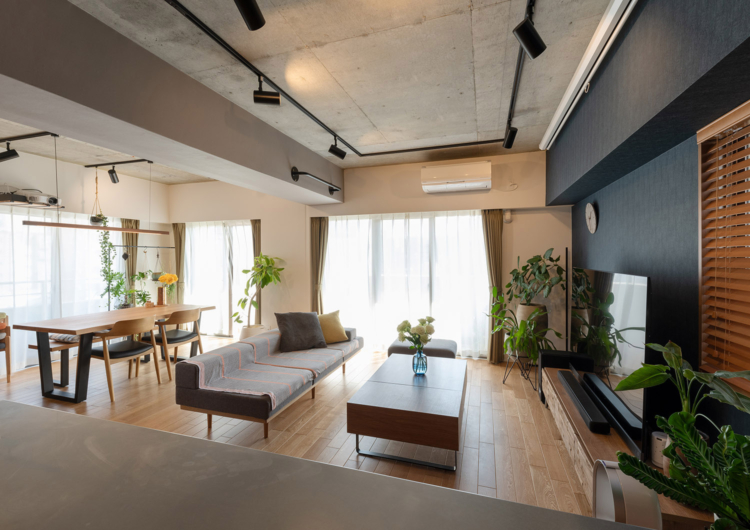 ライフスタイルを間取りに反映させながら、建物が持つコンクリートの肌つやと木の質感を活かした空間に観葉植物や花の瑞々しさが映える住まいが完成しました。