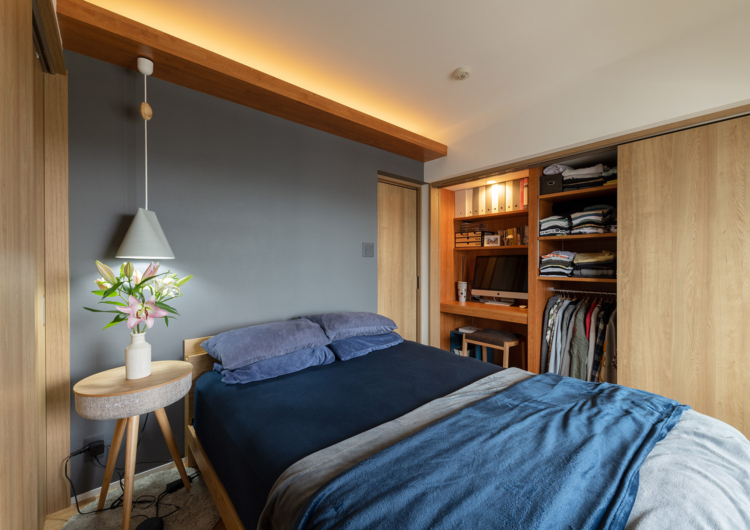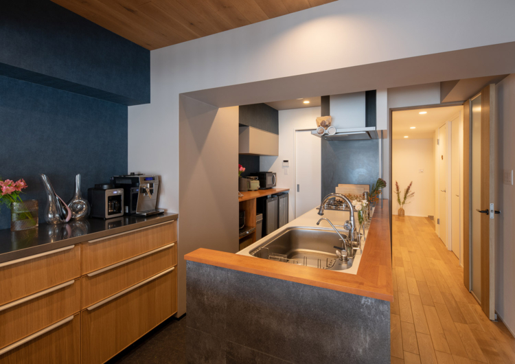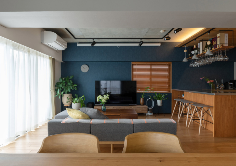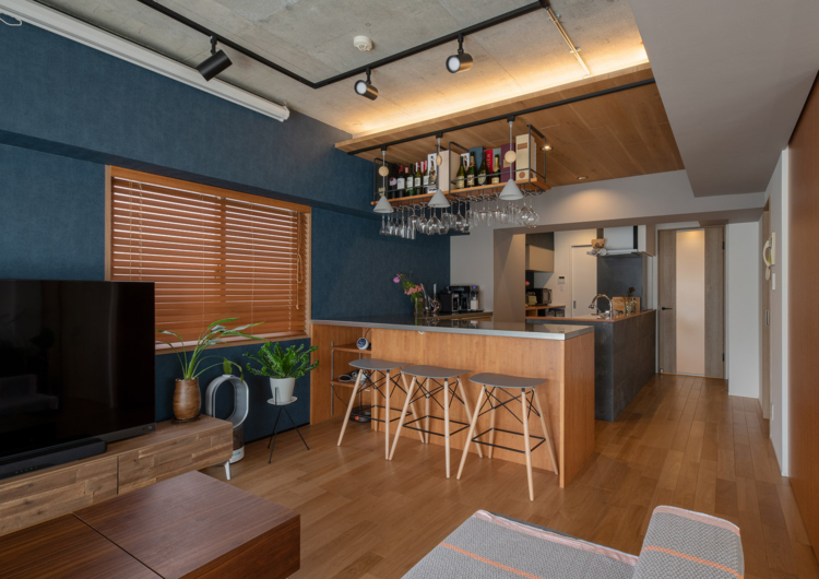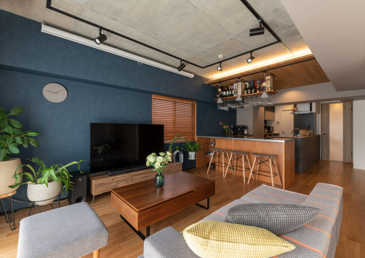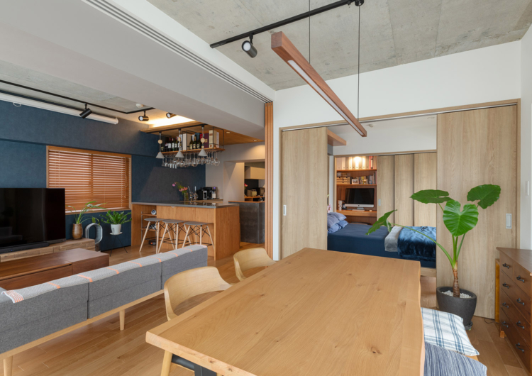 3方角部屋の南側に広がるリビングと隣接する洋室は造作の3枚引戸の建具になっており、普段は都心でありながら開放的で寛げる広々とした空間として、来客時には間仕切るなどフレキシブルに変化します。南側特有の豊かな自然光を、キッチンからリビングまで続くネイビーで仕上げたアクセントウォールが柔らかく受け止める空間に。また、マンションの最上階は全て解体すると、コンクリートの天井に断熱材を施している事が多く、コンクリート面を表して計画をする事ができないのがほとんどです。その為、天井を組む計画にしていましたが解体後、外断熱で施工されており躯体もきれいであったことから、お施主様のご意向で着工後に躯体表しへと計画変更。天高が上がり、照明計画も再検討したことで、より理想に近いデザインとなりました。