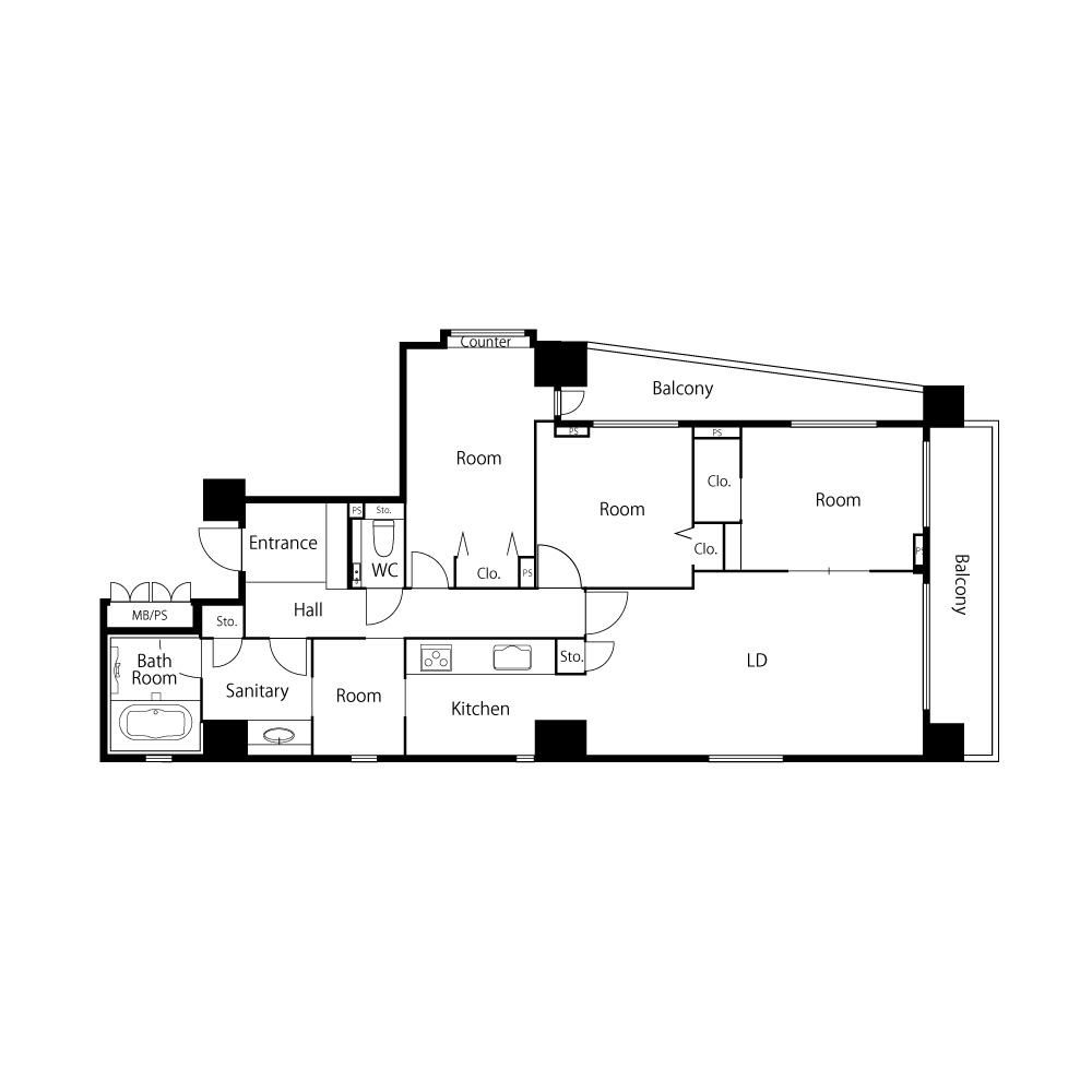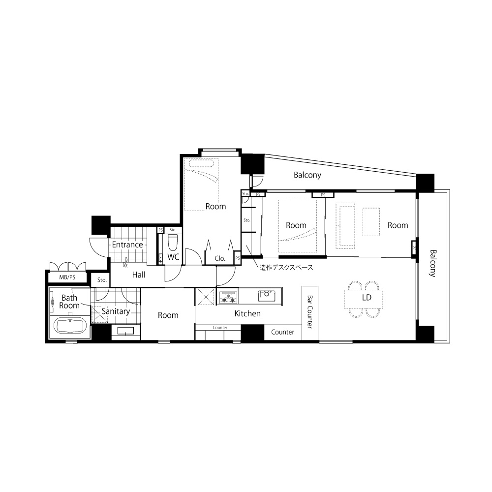 既存の間取りは、区切られた居室と閉鎖的なキッチンで閉塞感を感じる空間構成になっていました。そこで、友人を招くことが多いお施主様のライフスタイルから、プライバシー性に配慮した所要室を確保しながらも、開放感あるLDKとバーカウンターを備えたキッチンエリアをポイントにした間取りをご提案しました。