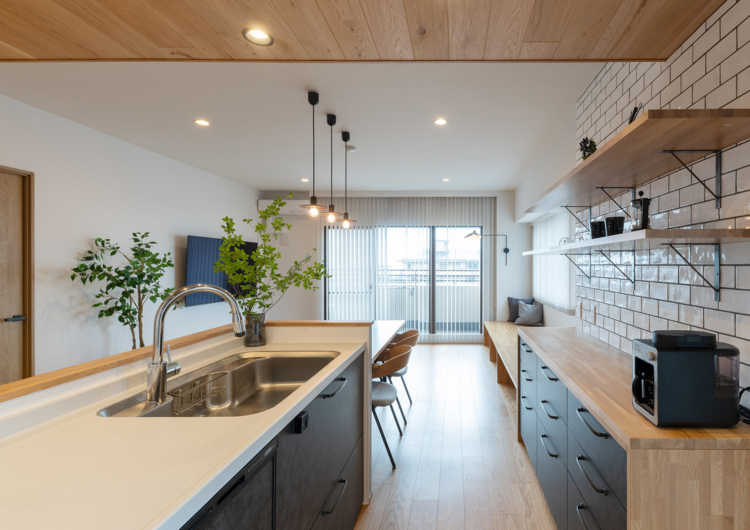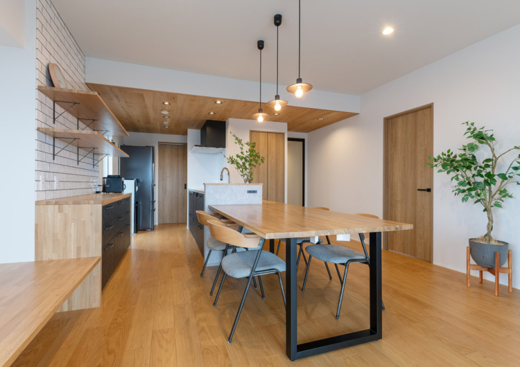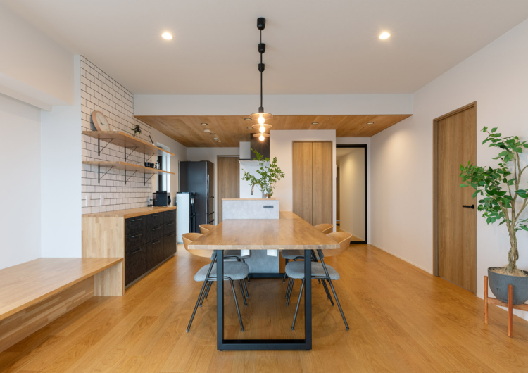 ご家族が長い時間を過ごすLDKの中心には、テーブル一体型造作壁キッチンを設けました。こちらは、キッチン仕様は最低限ながらも、天井にオークの羽目板を施すなど、デザインにこだわりコストを押さえながらも家族団らんの中心となる空間に。また、富士山を望める窓下に設けたヌックは、TVを見る為のベンチに、時には富士山をながめゆったりする時間にと多用途に使える寛ぎ空間になっています。
