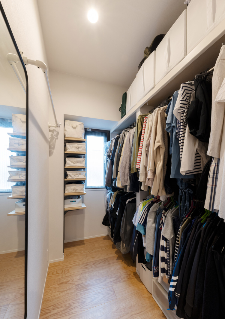 そこで家事時間が長い水廻りについて、キッチンから→洗面室→男性陣用のファミリークロークと回遊性をもたせ、効率的に動ける家事動線を描いています。また、帰宅導線(玄関→洗面室(手洗い)→ファミリクローク→各部屋へ)も回遊できるようにすることで、アウター等が散らかりずらい生活動線にもなっています。