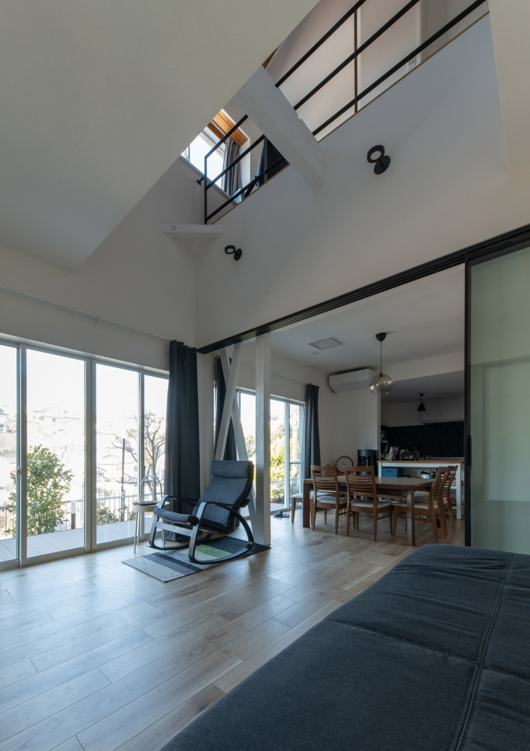 お子様の誕生を機に、ご両親の持ち家を2世帯住宅へリノベーションし同居を決断されたお施主様。各世帯が玄関からすべて分かれている完全分離型ではなく、玄関と水回りは共同で使い、その他の居室は人数や用途に応じてしっかり確保しつつ、湘南エリアという立地を活かした、開放感が高く現代の暮らしに合わせたプランを希望されました。