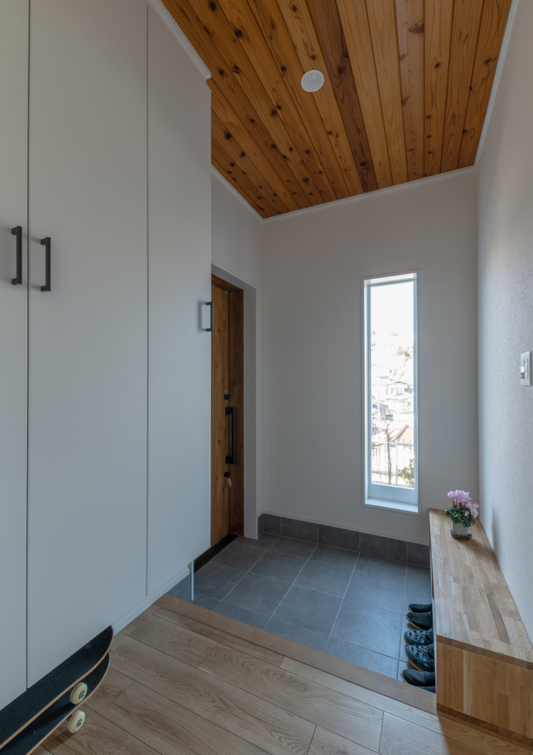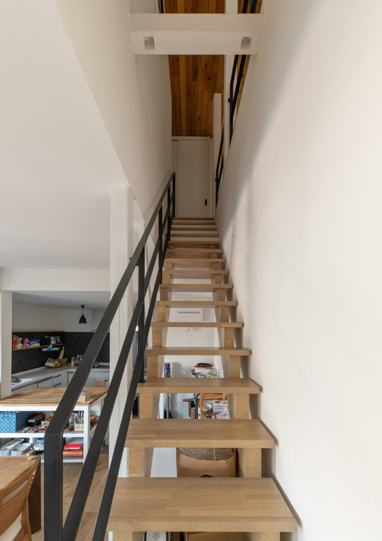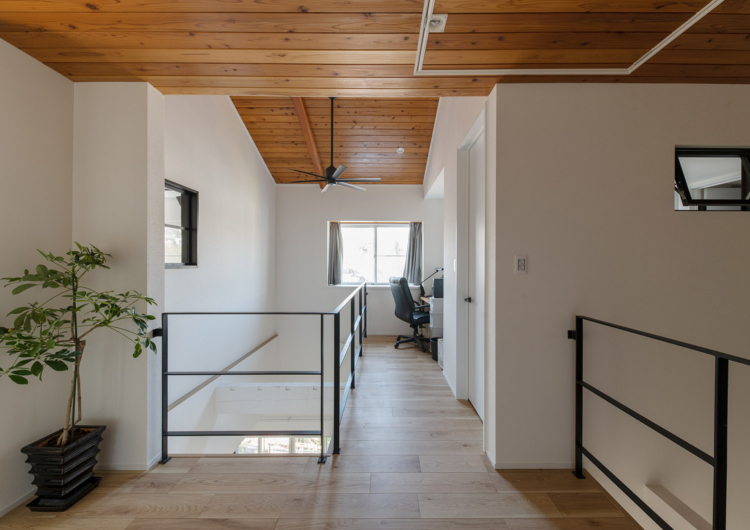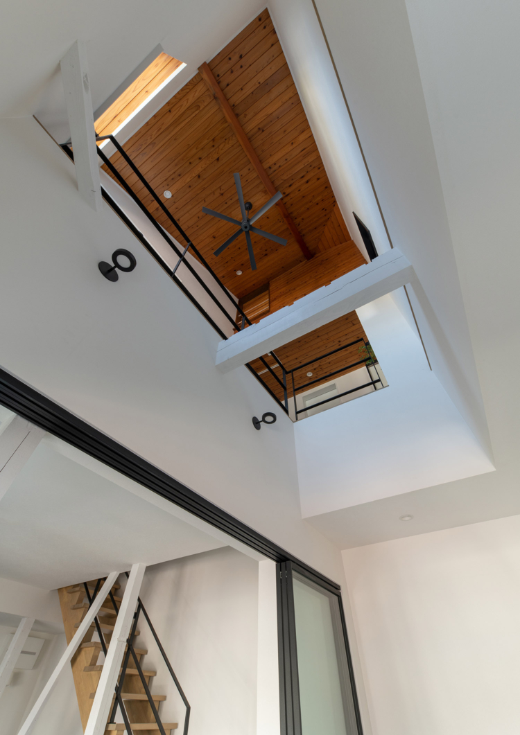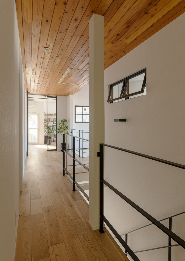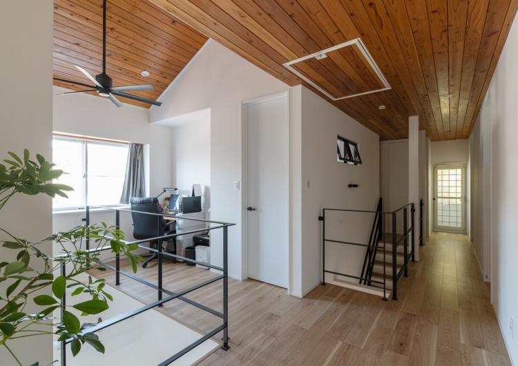 既存住宅で思い入れがある壁の羽目板材を再利用したいとのご要望に応え、2Fの天井材として復元をしています。こちらは、リビングに設けた吹き抜け越しに見える場所になっています。また、リノベーションで新たに取り入れた建材との雰囲気とも調和するように素材選びにも配慮しました。