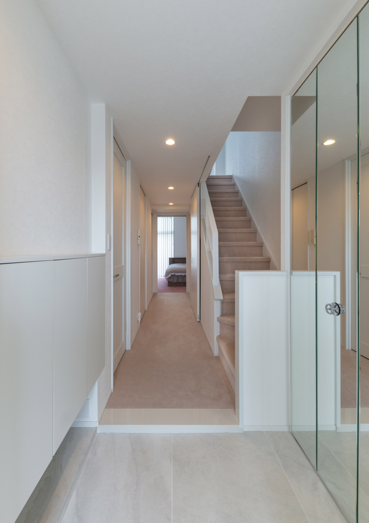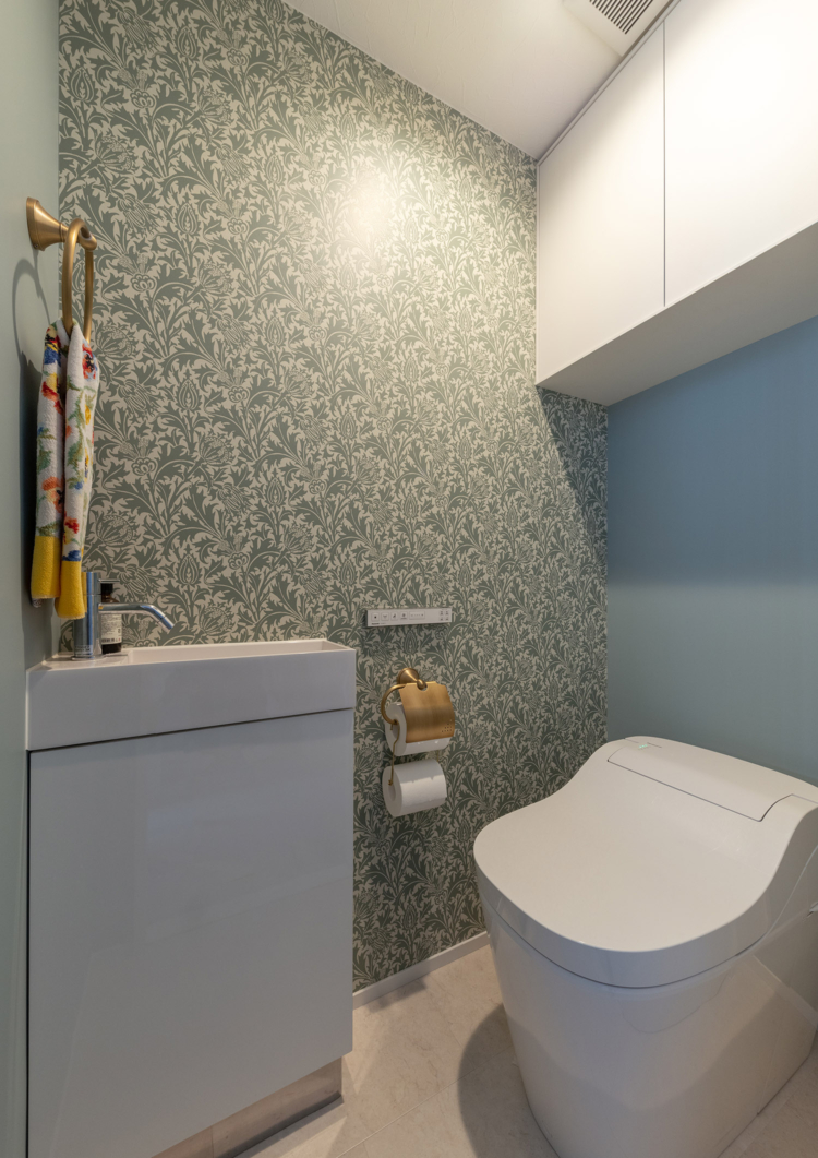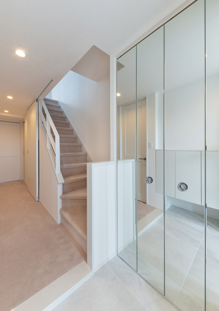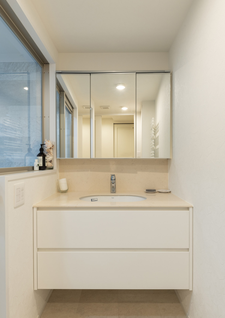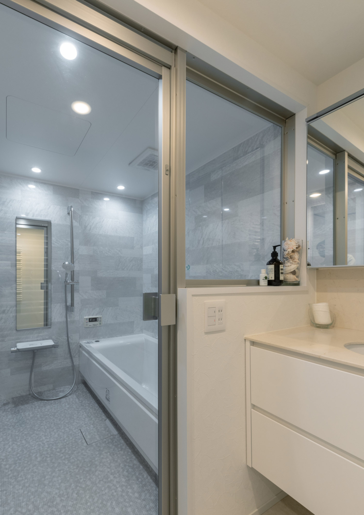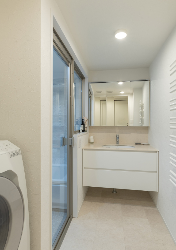 床材は、マーブルの鏡面タイルを採用し、白を基調としながら素材感の違いを取り入れることで洗練された印象の空間に仕上げています。