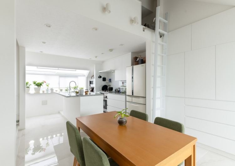 頂いたご要望は、上階にLDKが配置されているのを下階に移動し、水廻りをまとめバリアフリーにしたいということ。また、友人を招きホームパーティーができる空間を希望されました。その他、空間イメージとして、ホワイトをベースにしたスッキリと清涼感のある空間デザインに床材はタイルにし、趣味のお菓子作りがしやすいアイランドキッチンにしたいと具体的なイメージをお持ちでした。
