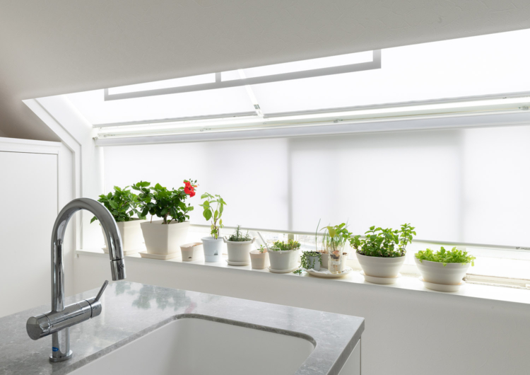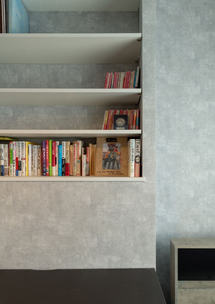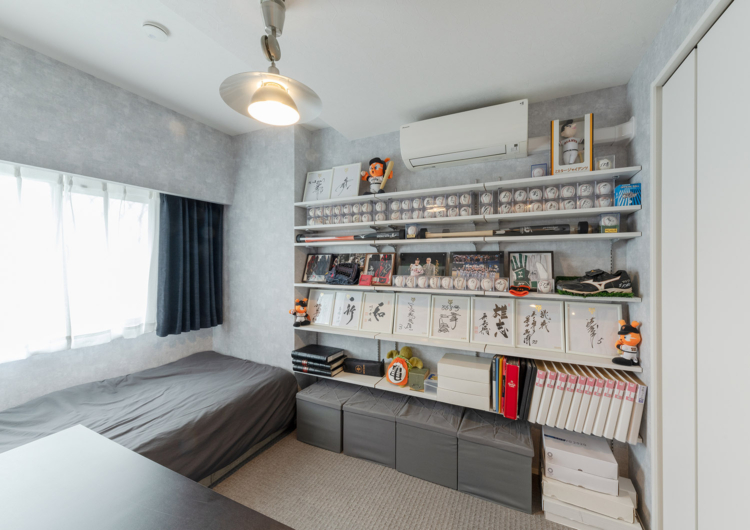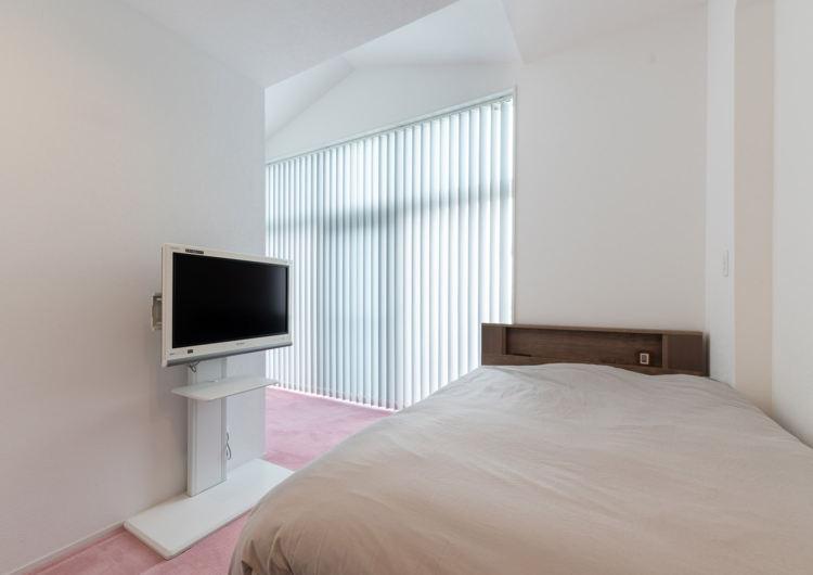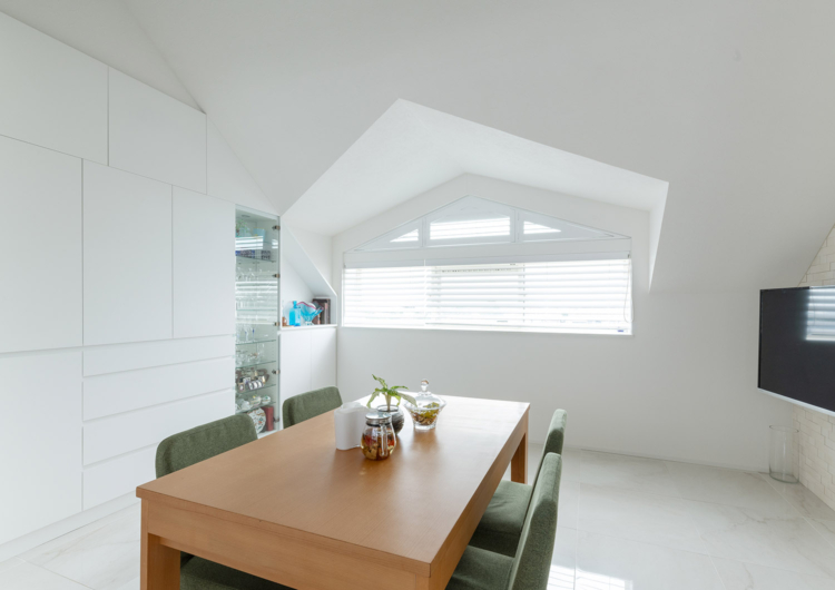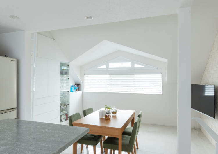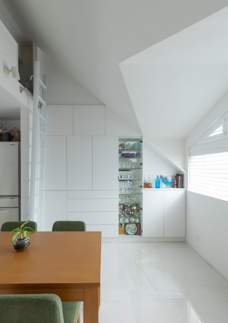 まず、最上階でメゾネットであることから、天井も高く、勾配天井や高窓もある特別なマンション。そのスペックを活かすべく、様々な工夫を重ねました。上階のLDKに新たにロフトを設け、収納空間を追加。さらに、勾配天井で異形状な壁天井に合わせ、無駄なく壁面収納をオーダーで造ることで、収納力が高く、スッキリとした空間を保ちやすくしています。三角窓からは、西日が入ることから見た目と遮熱にもなるウッドシャッターを施しています。
