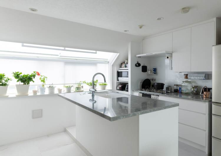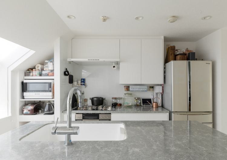 独立型で閉塞感があったキッチンは、自然光で明るく清潔感のあるアイランドキッチンに。天板にはクォーツストーンを採用したホワイトのオーダーキッチンで、お菓子作りや友人をおもてなししやすい造りになっています。