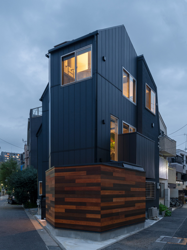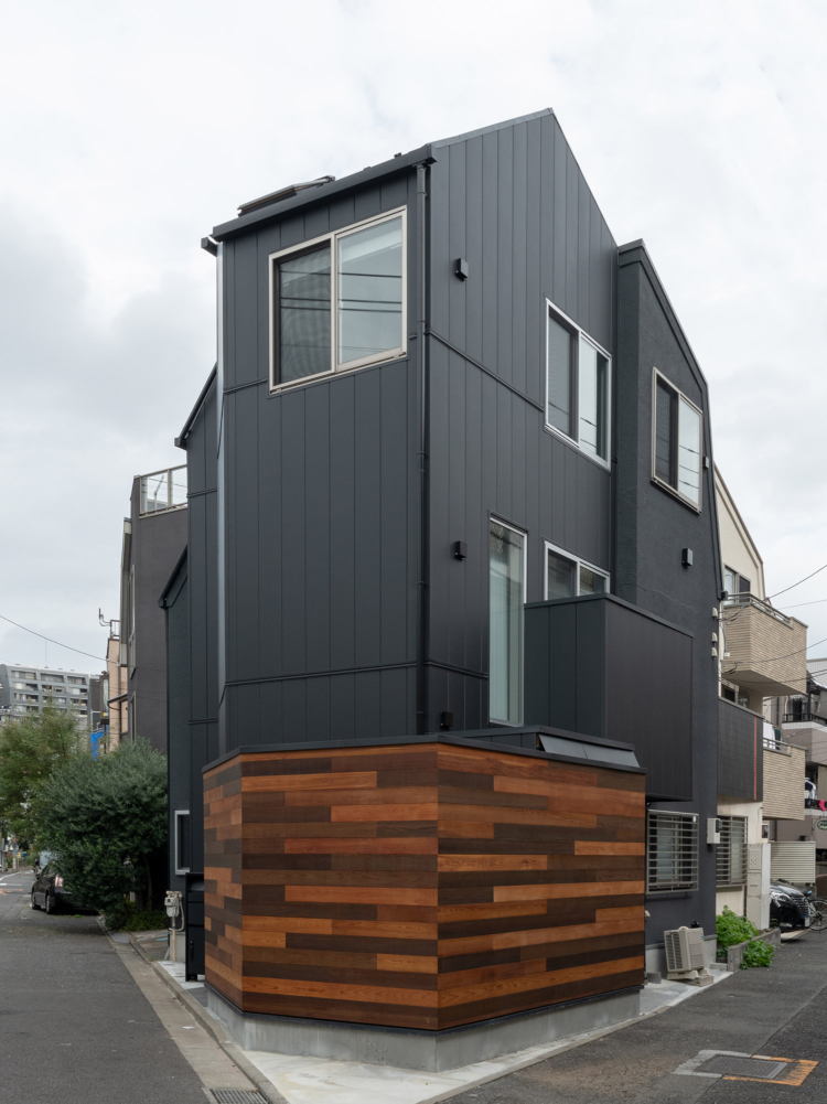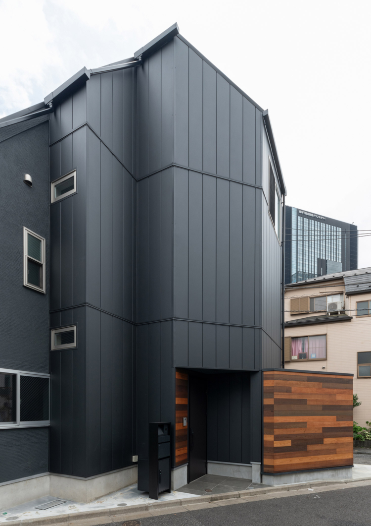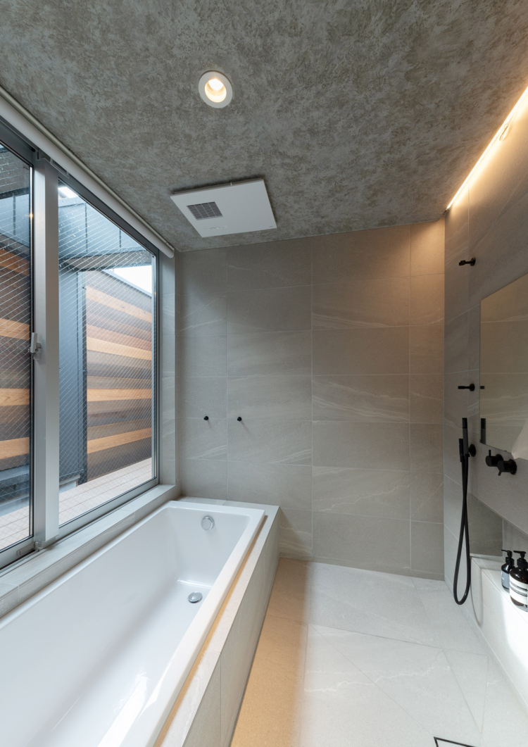 そこで、タイルが印象的な在来浴室空間の大窓に、外からの視線を遮るためレッドシダーで仕上げた高い塀を新設(※1)し、ガルバリウムとの素材感の違いが印象的な外観になっています。
