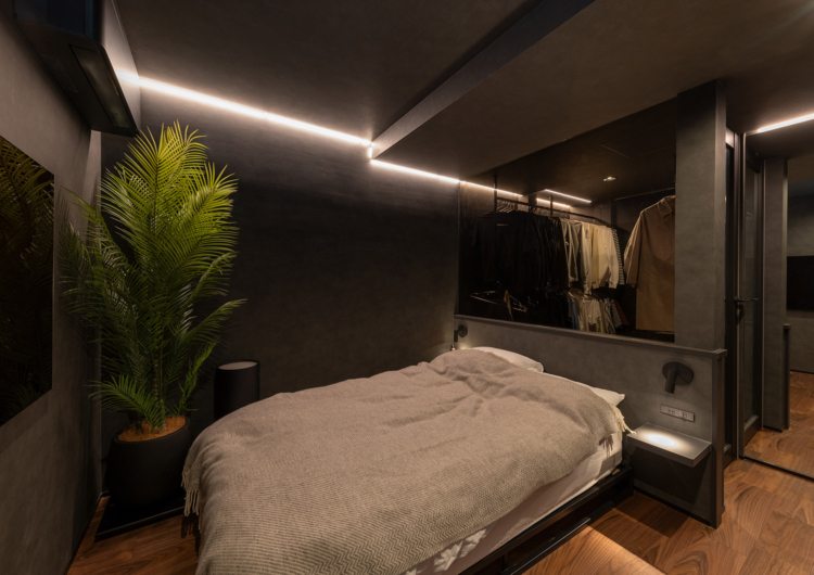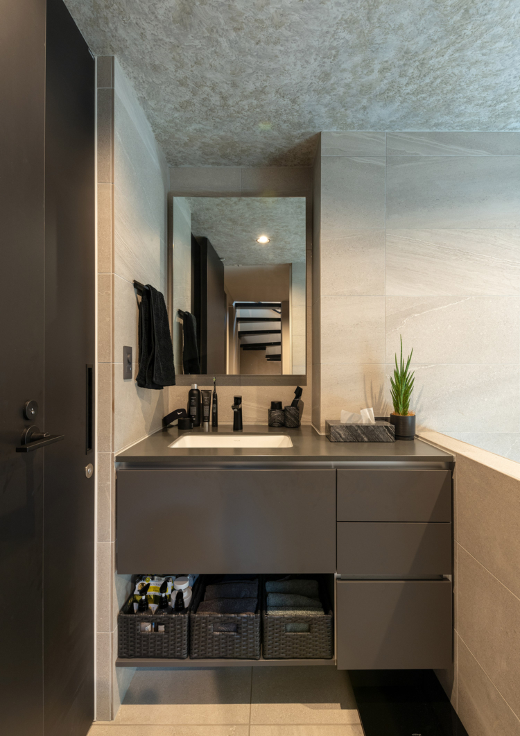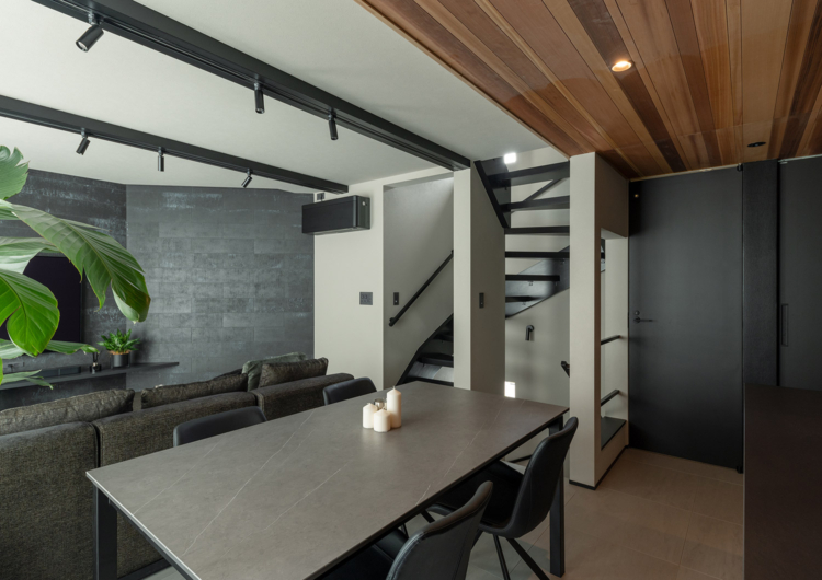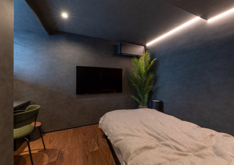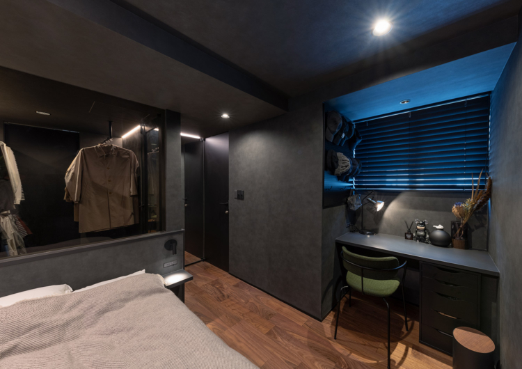 内部では、「非日常空間に暮らす」をコンセプトに、造作家具を多く採用し機能的なホテルライク空間になるようにデザインは統一しながら、各フロアごとに採用するマテリアルや照明計画を変化させることで、各所で面白みをだしています。