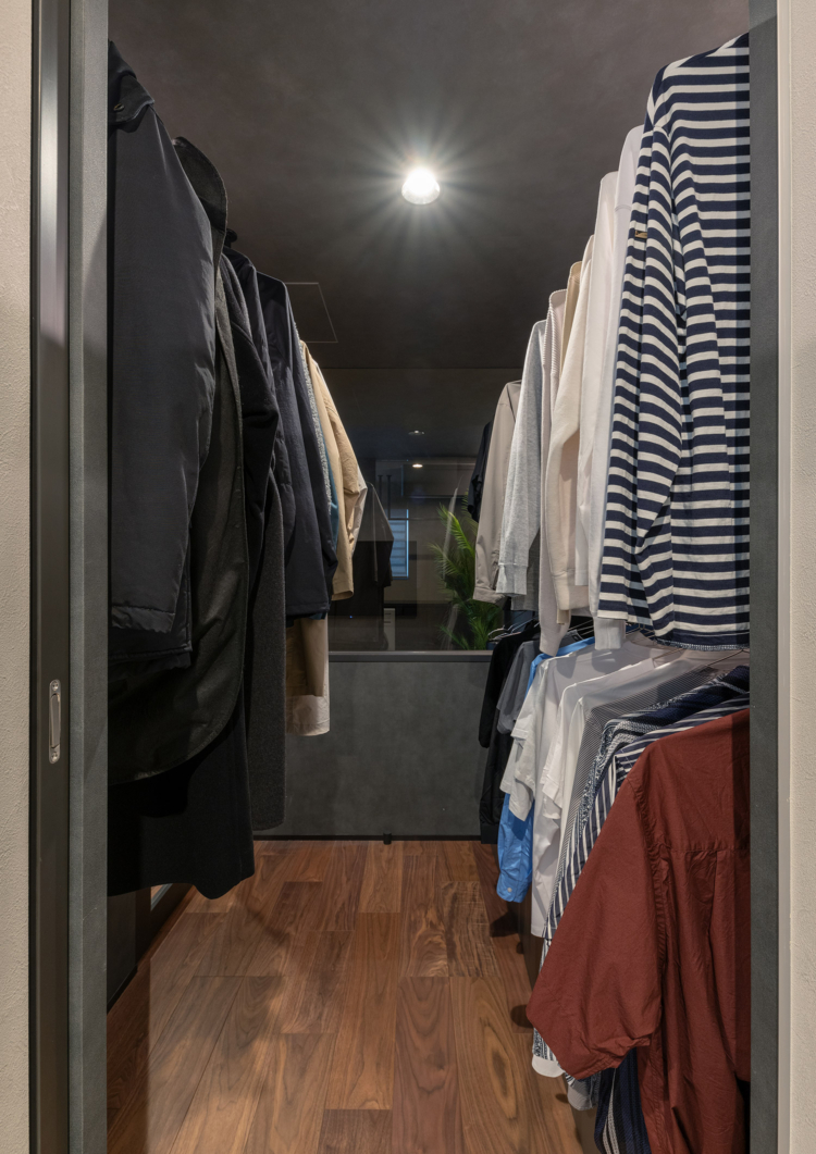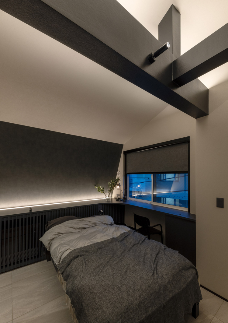 寝室とバスルームを配置した1階は、温かみのあるフローリングにダウンライトとライン照明で、落ち着きのある空間に。バスルームには、家事動線がよくなるようにランドリールームとウォークインクローゼットを隣接させています。