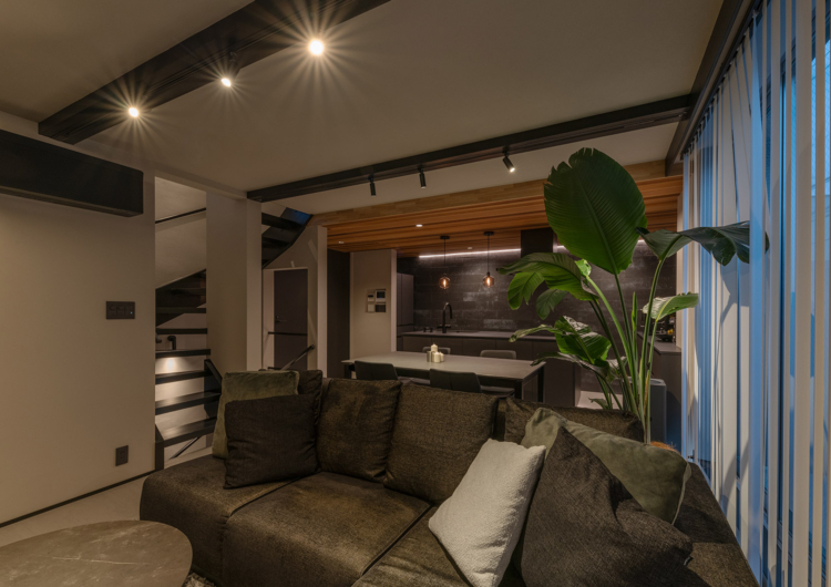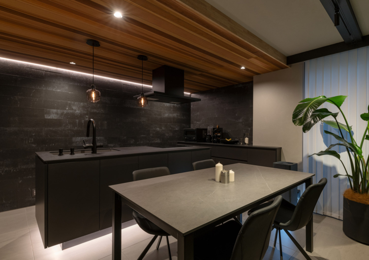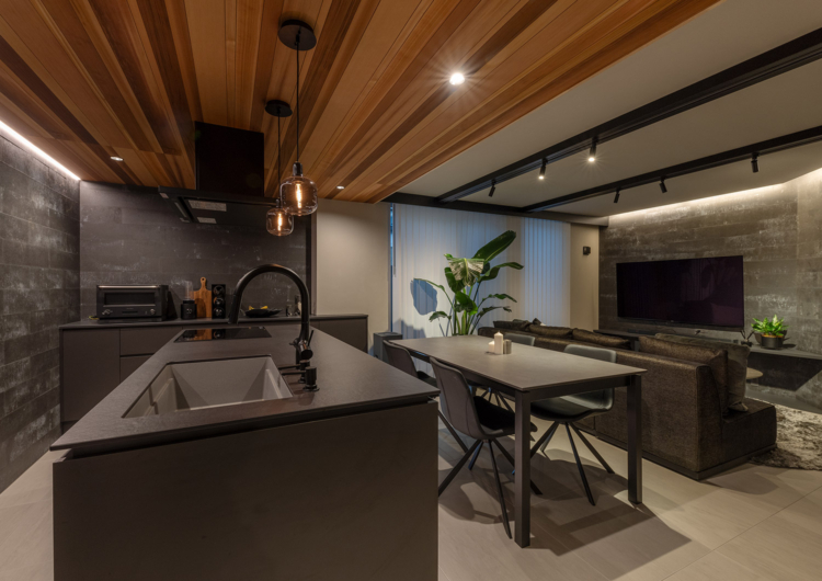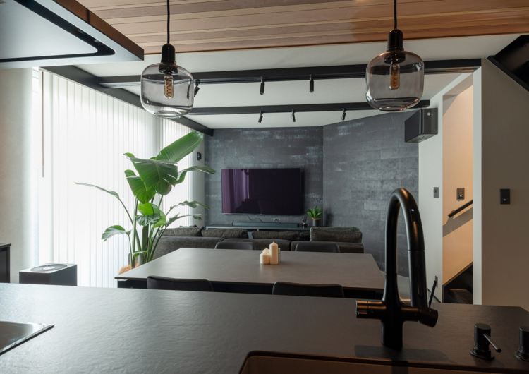 2階は、高級感あるフロアタイルにスポットライトとペンダントライトが印象的なLDK。キッチンはオーダーのアイランド型でサイドにカップボードを設けることで、背面のアクセントウォールが際立つデザインに。