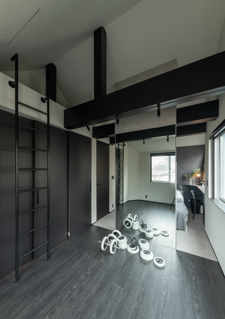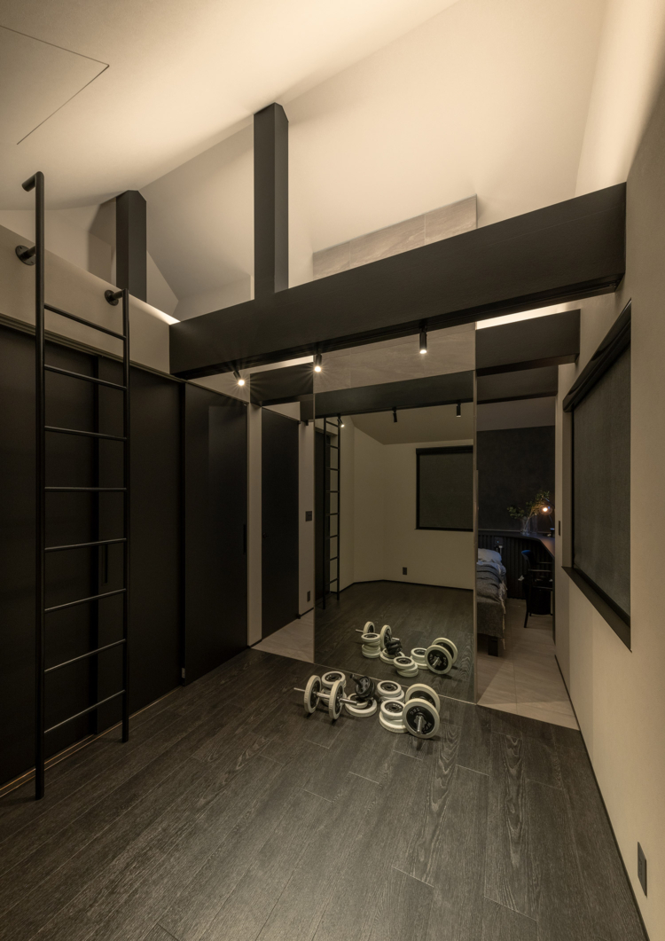 ジムスペースやワークスペースを設けた3階は、トレーニングがしやすいように、床は塩化ビニール系のタイルを採用し、大判の鏡を設置したことによりより広く開放的な空間になっています。