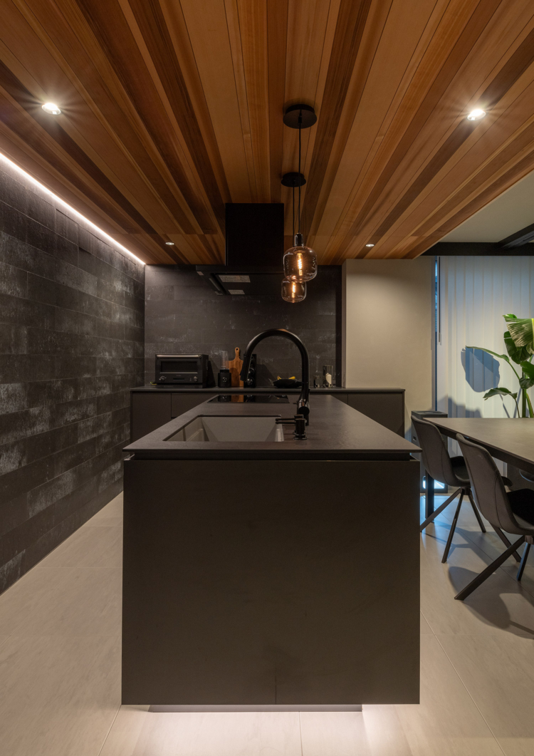 初回の打ち合わせ時から、御施主様のご要望は、内観だけでなく外観も大きく変えていきたいご意向で、デザイン面は最初から一貫してガルバリウムやレッドシダーを用いた武骨で重厚なデザインイメージと、機能性とデザイン性を両立させたホテルライクな空間イメージをお持ちでした。