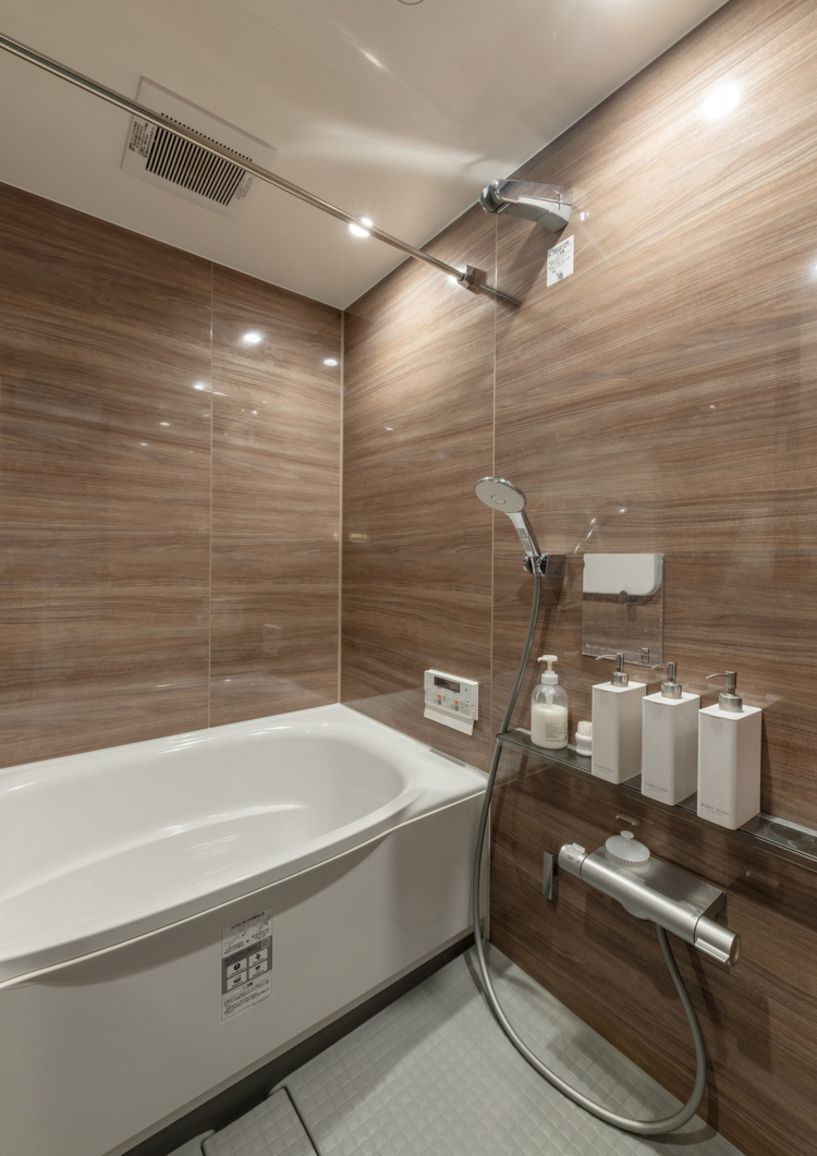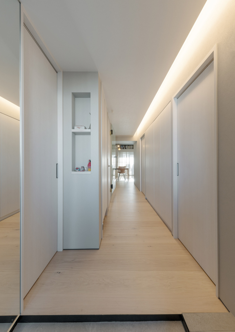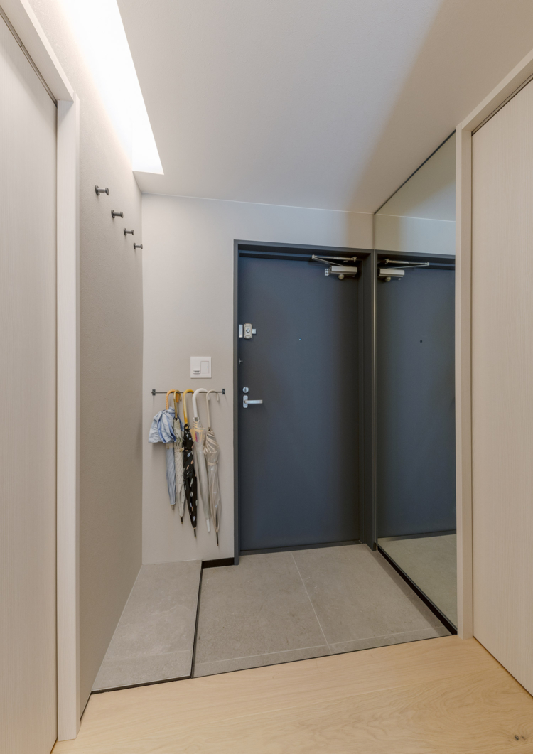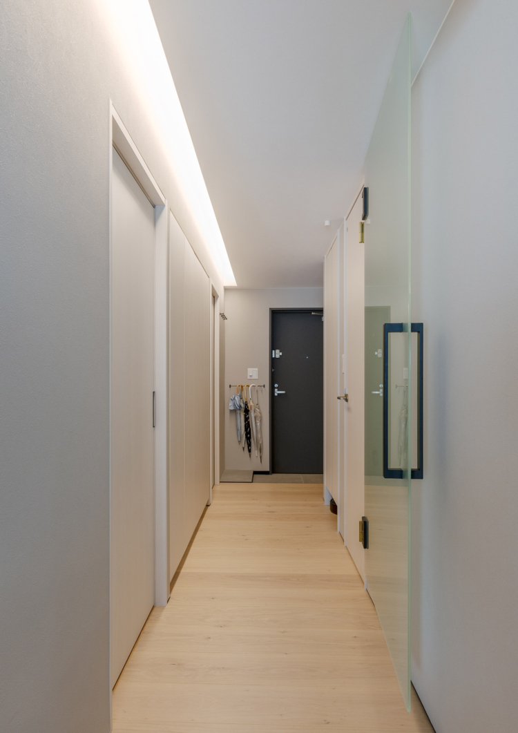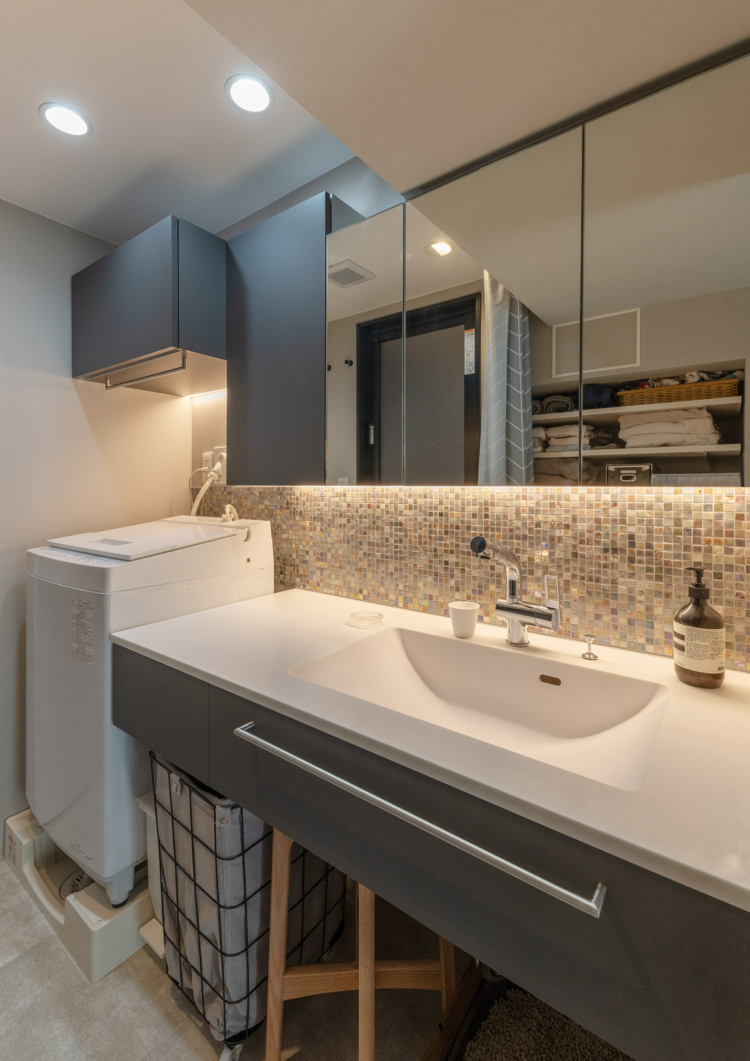 水廻りは、キッチン→洗面・浴室→ウォークインクローゼット→寝室を直線状に配置。ガス乾燥機を取り入れ、洗濯物を洗う・乾かす・仕舞うをコンパクトにできる家事動線を実現しています。家事”楽”要素は、リビングの建具の下部にあえて隙間を作り、ルンバが通り抜けできるようにしています。