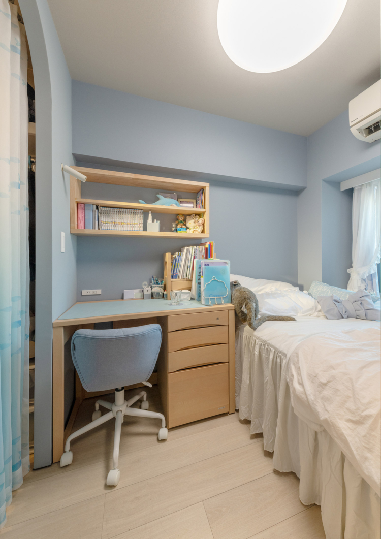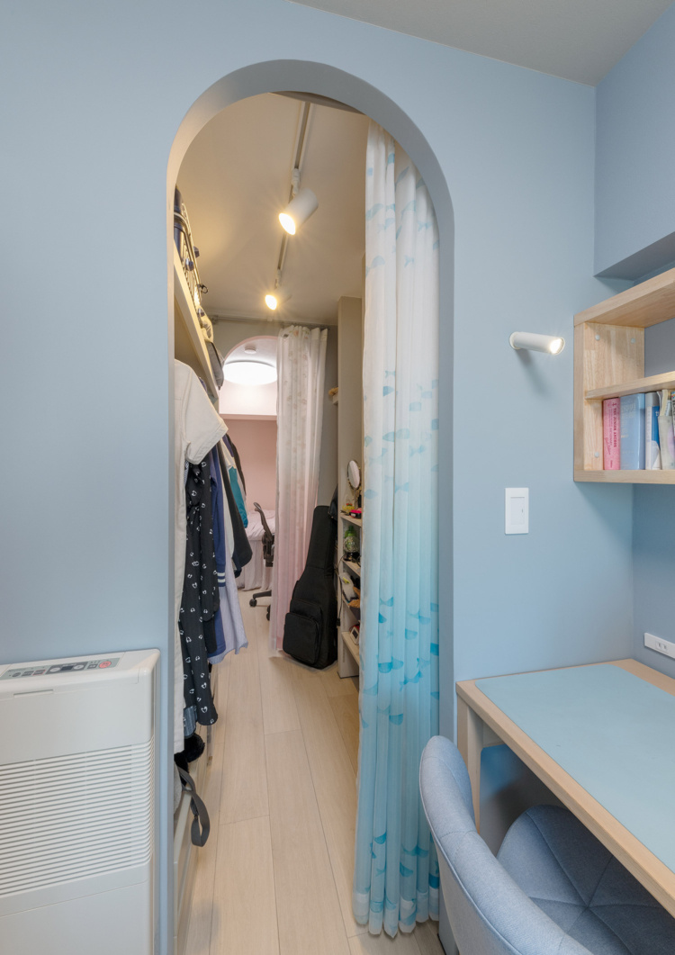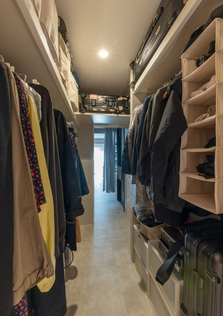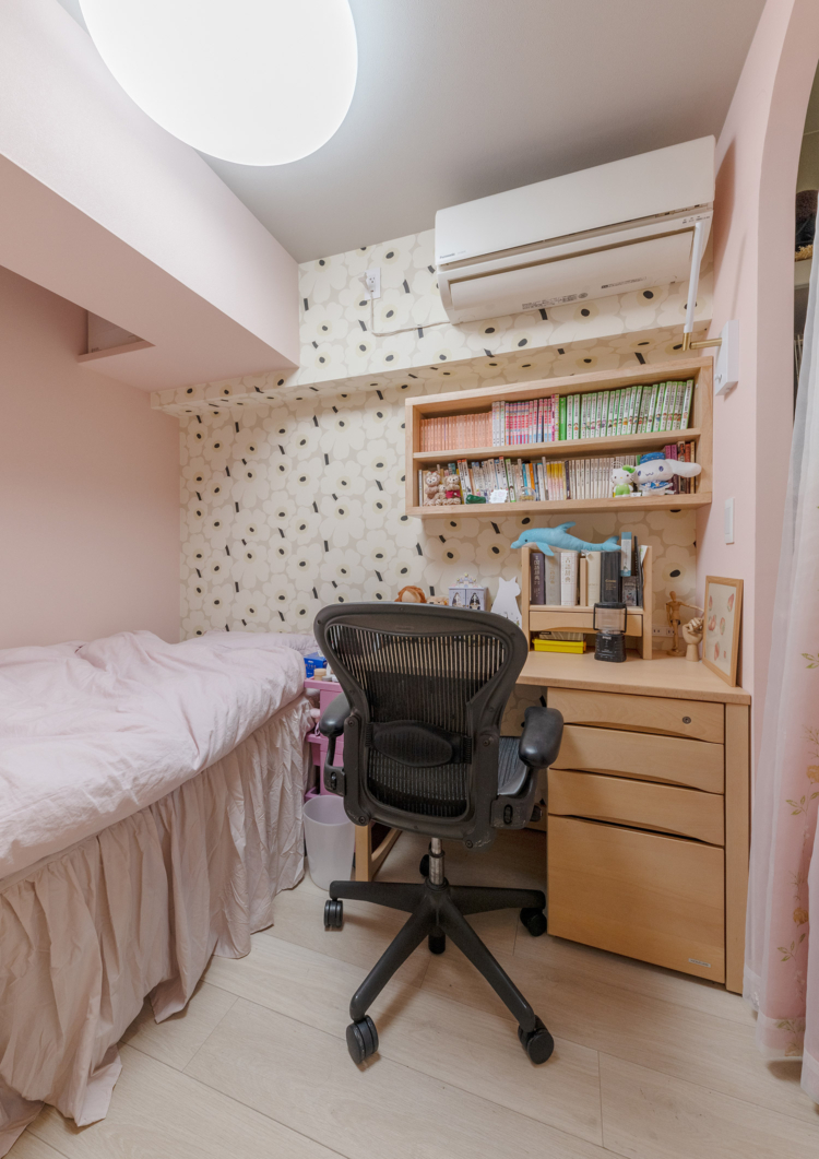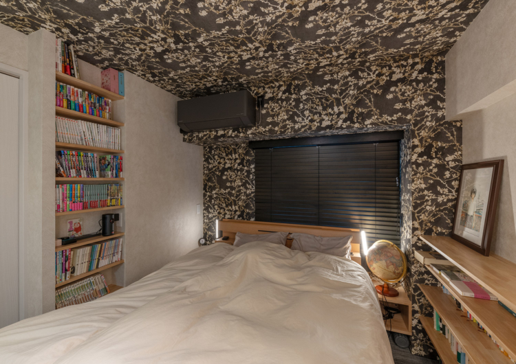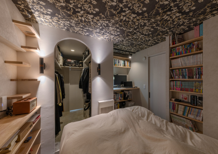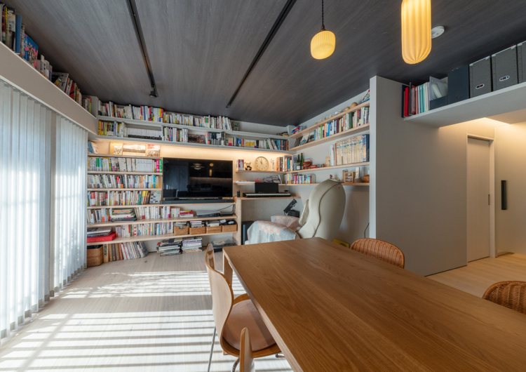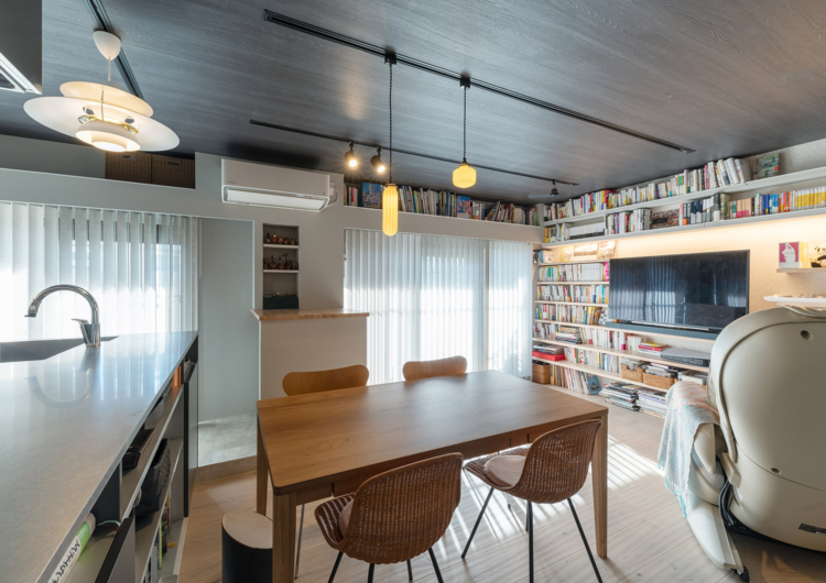 収納の改善はキッチンだけでなく、本や物を多くお持ちでしたので、各所に分散させています。ご家族共有のものや本はリビングの壁を本棚として使えるようにオープンな収納棚に、居室にも本棚を設けました。また、本棚エリアにはキャットタワーを設け、猫も楽しめるお施主様ならではの住空間に。お子様の部屋と部屋の間には、ウォークインクローゼットを設け、収納空間を共有することで収納力を高めています。
