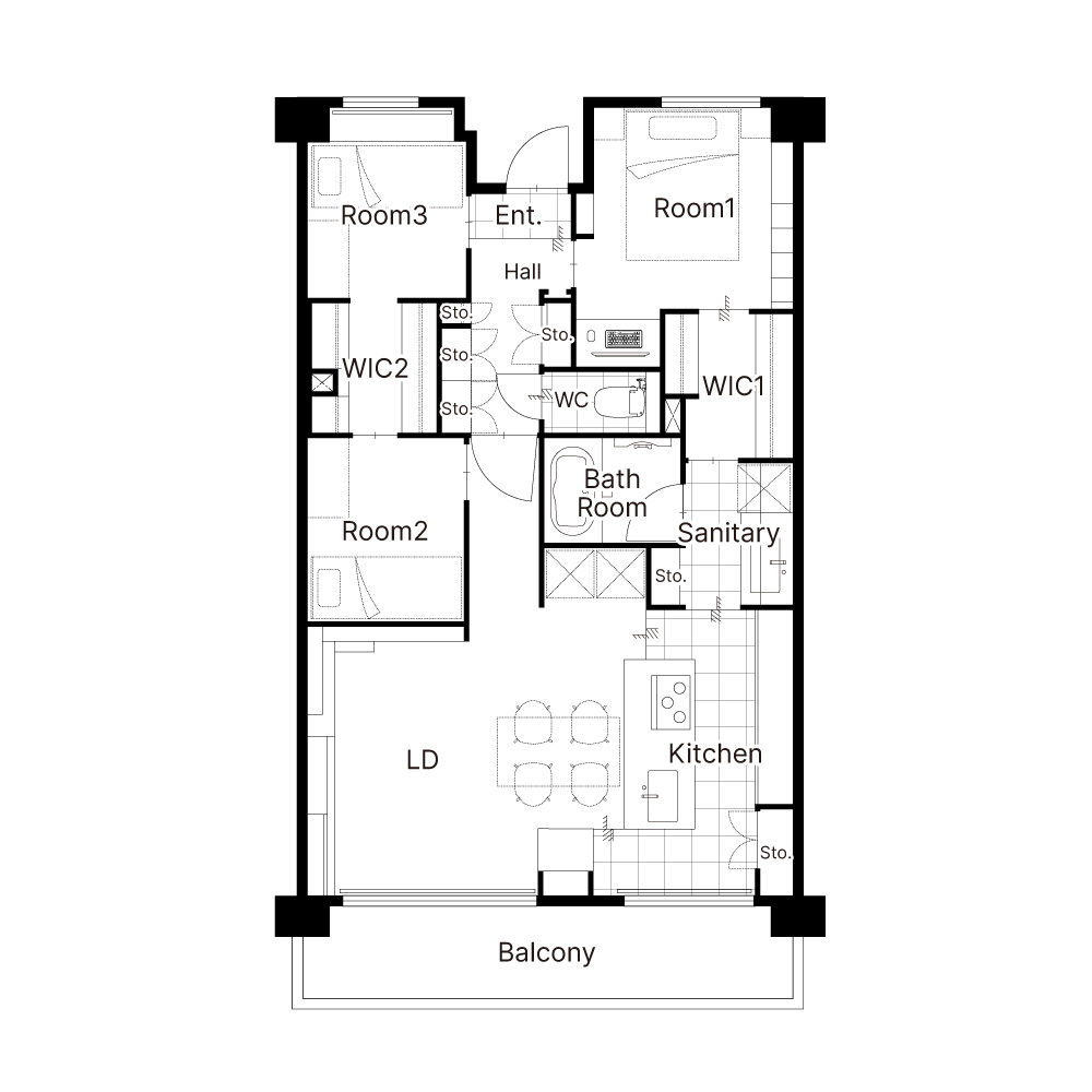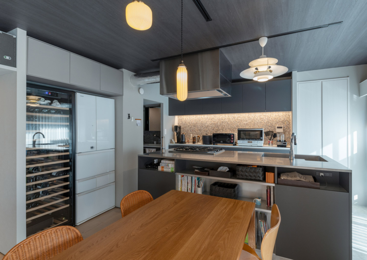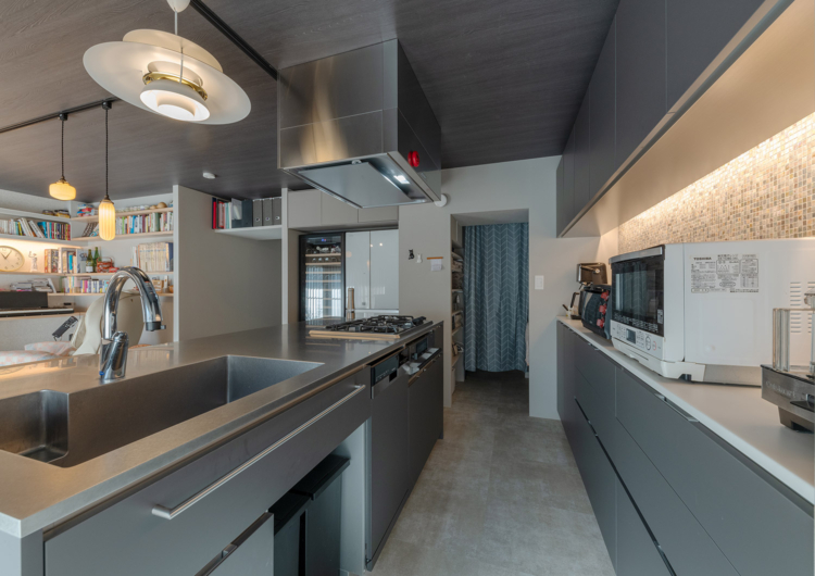 そこで、ご家族の皆さんが趣味でも使われるキッチンを主軸に間取りの検討を進めていきました。キッチンのスタイルはアイランドで、キッチン廻りに回遊性を持たせ、2人以上で作業をしていても快適に行き来ができる空間にしています。また、キッチンサイドにも収納を設け、コンパクトな住空間ながら収納力の高いキッチン空間に仕上げています。