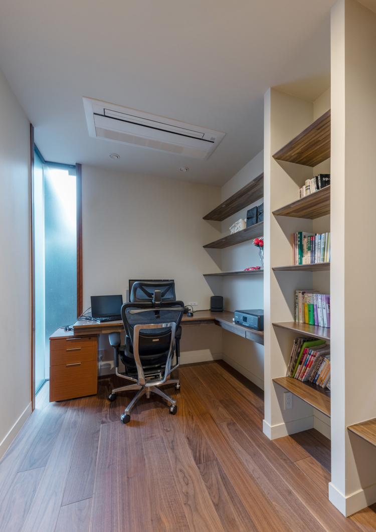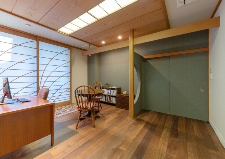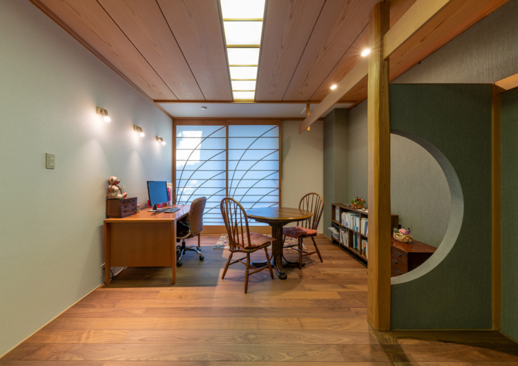 また、元は和室だった書斎は、既存のマテリアル(天井照明や障子)や開口形状を残しつつ、過ごしやすいマテリアル(フローリングや建具)に変更しています。