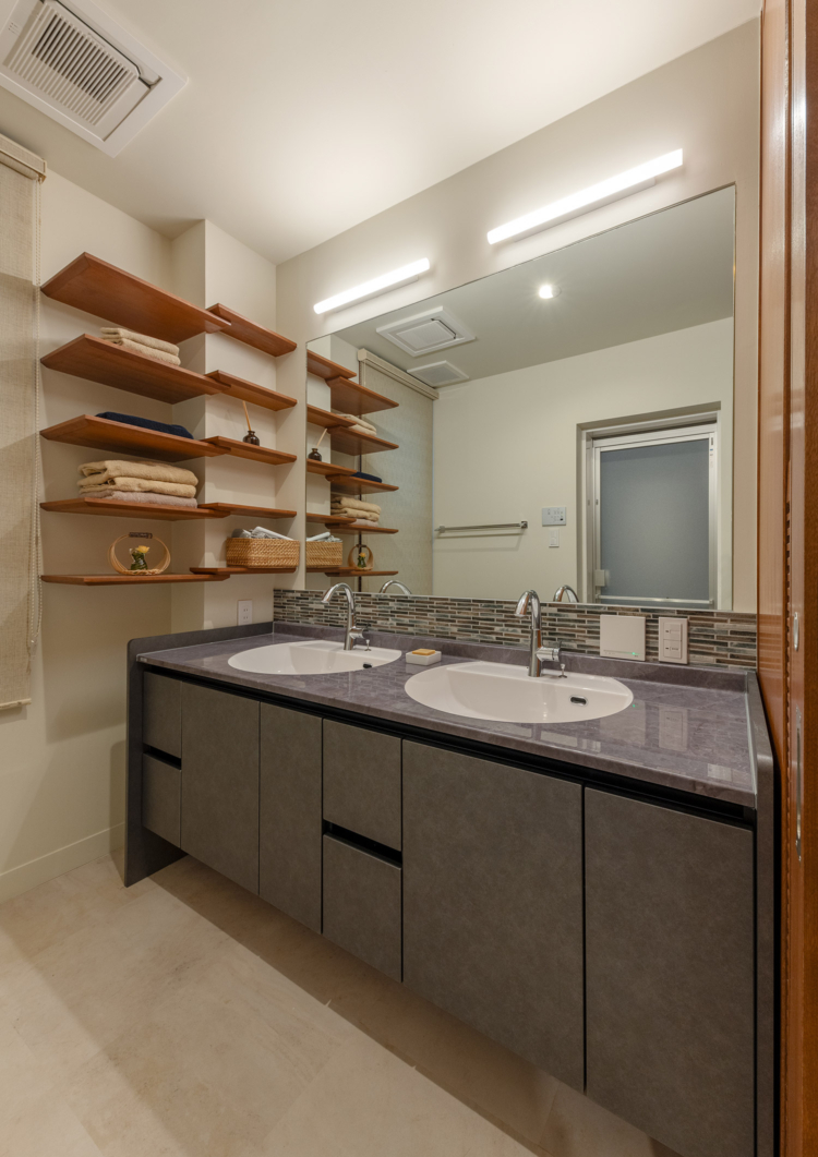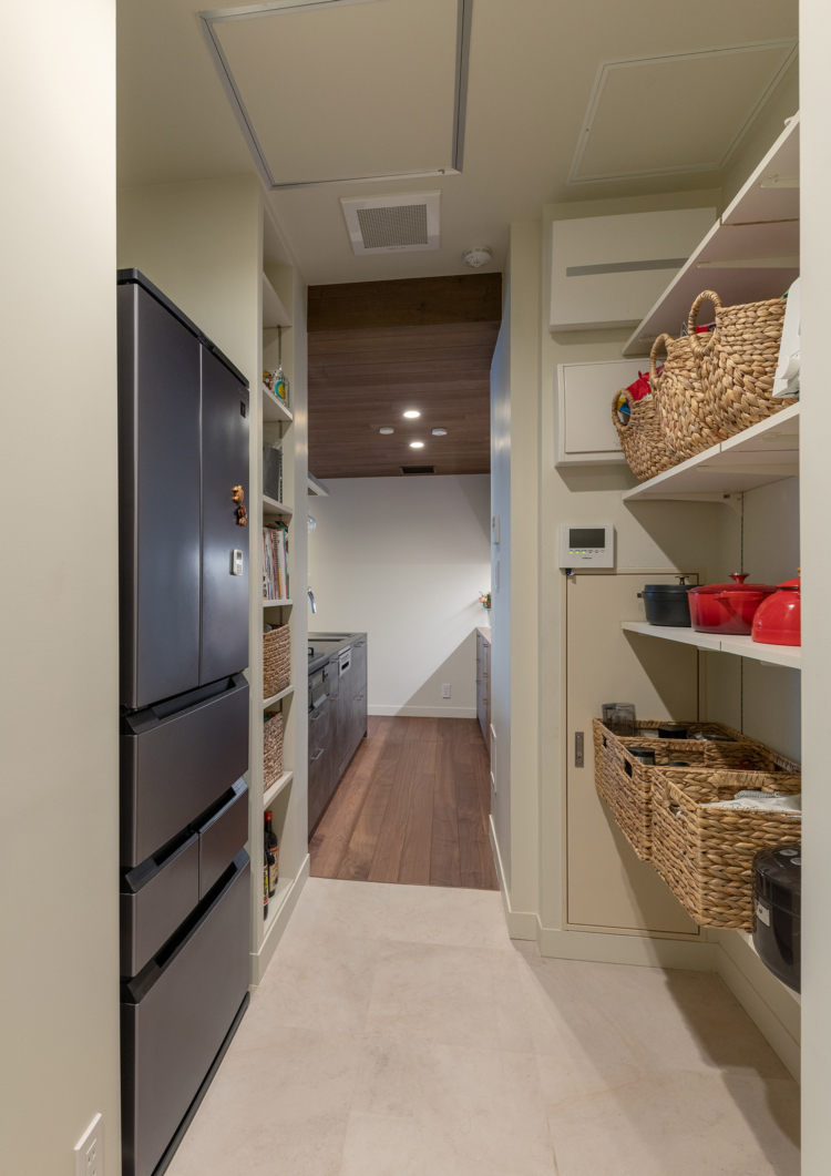 そこで、ご提案したのが家事の中でも滞在時間が長くなるキッチンを起点に、隣接するパントリー兼、家事室から洗面・浴室、書斎へのアクセスが良くなる動線です。在宅ワークに集中できる独立した書斎ながらも、水廻りへの動線をよくすることで、お茶の時間などの隙間時間も有効に活用できる空間になっています。